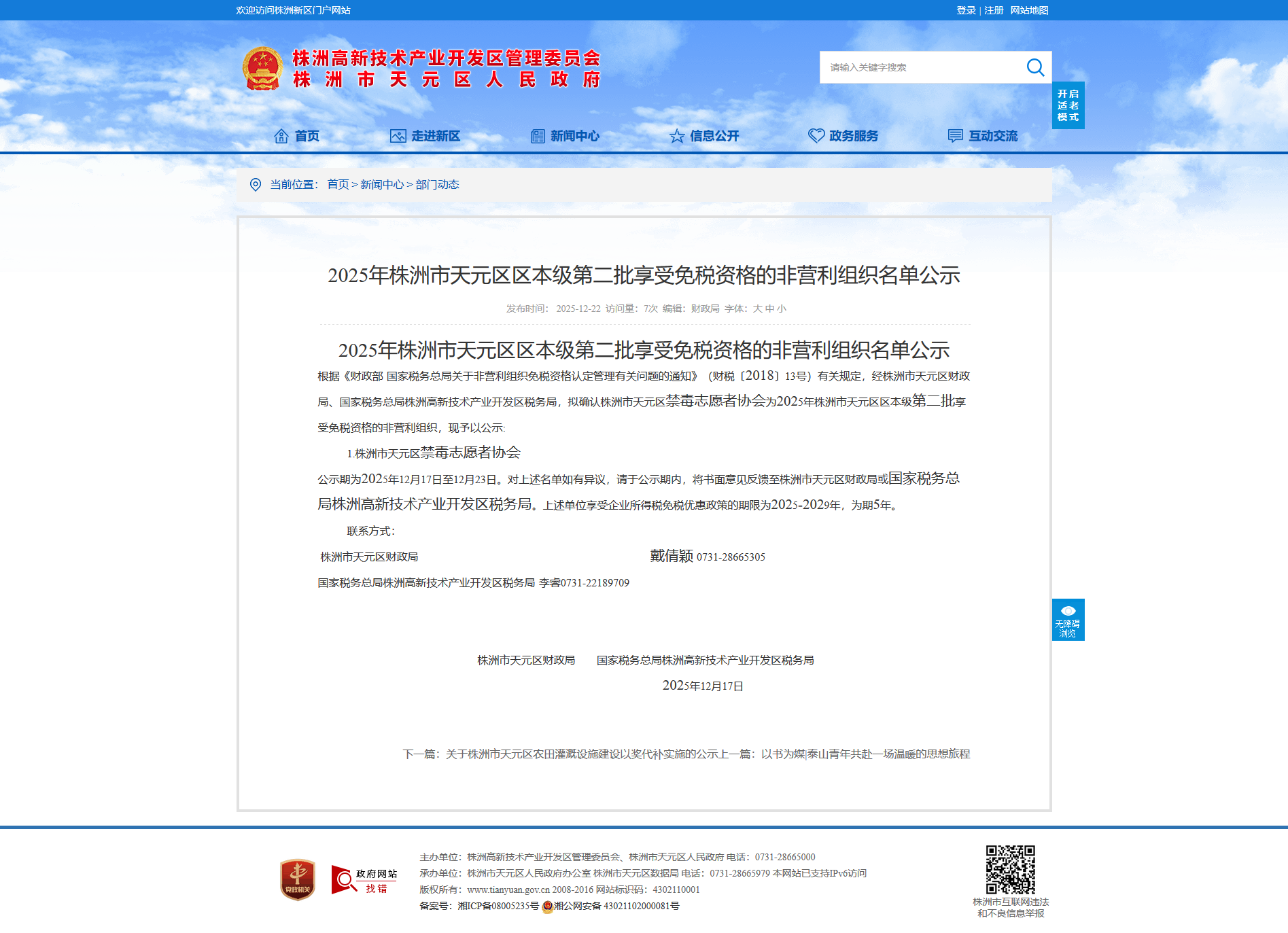 根据《财政部 国家税务总局关于非营利组织免税资格认定管理有关问题的通知》(财税〔2018〕13号)有关规定,经株洲市天元区财政局、国家税务总局株洲高新技术产业开发区税务局,拟确认株洲市天元区禁毒志愿者协会为2025年株洲市天元区区本级第二批享受免税资格的非营利组织,现予以公示: