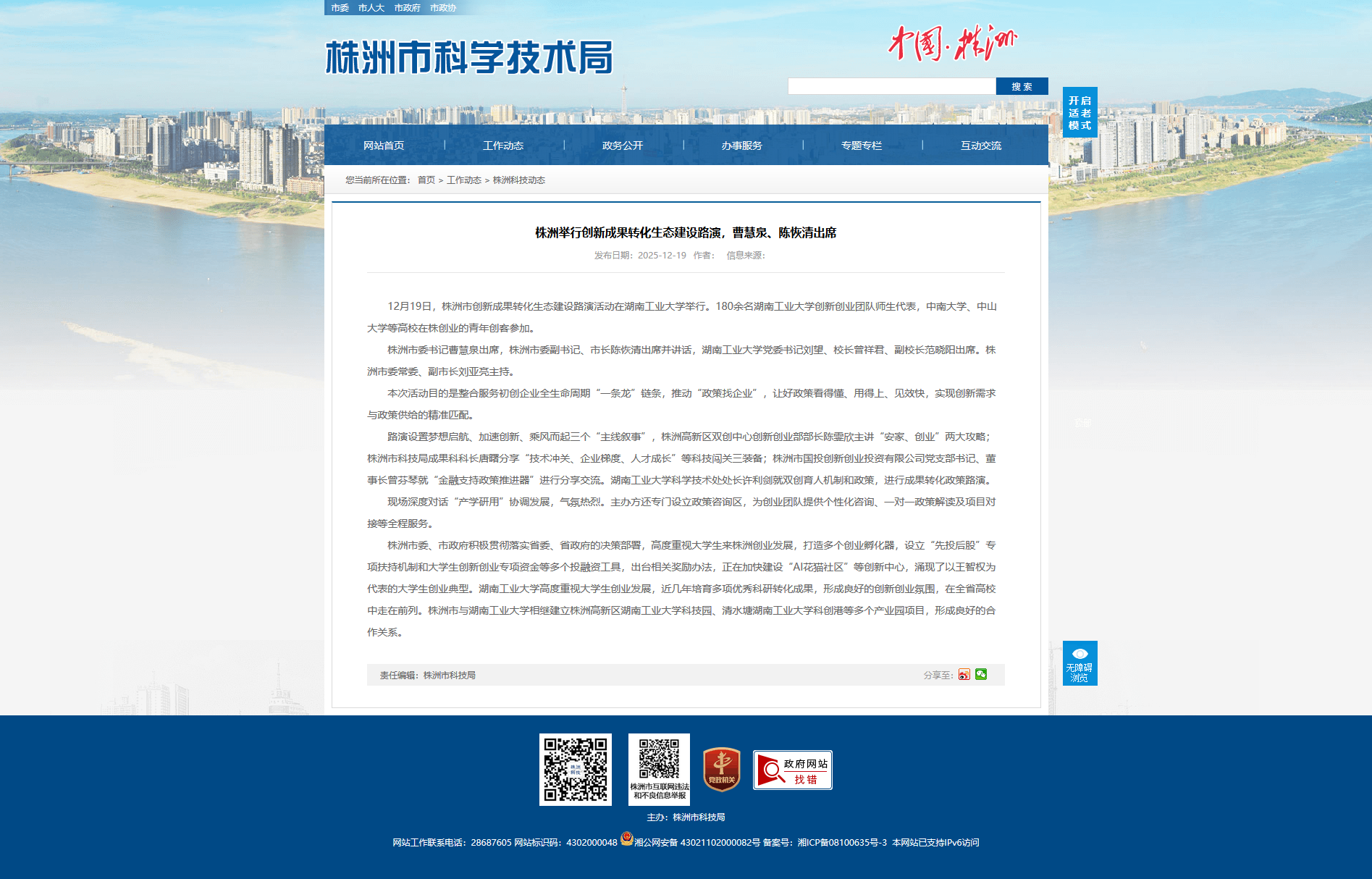 株洲市委、市政府积极贯彻落实省委、省政府的决策部署,高度重视大学生来株洲创业发展,打造多个创业孵化器,设立“先投后股”专项扶持机制和大学生创新创业专项资金等多个投融资工具,出台相关奖励办法,正在加快建设“AI花猫社区”等创新中心,涌现了以王智权为代表的大学生创业典型。湖南工业大学高度重视大学生创业发展,近几年培育多项优秀科研转化成果,形成良好的创新创业氛围,在全省高校中走在前列。株洲市与湖南工业大学相继建立株洲高新区湖南工业大学科技园、清水塘湖南工业大学科创港等多个产业园项目,形成良好的合作关系。