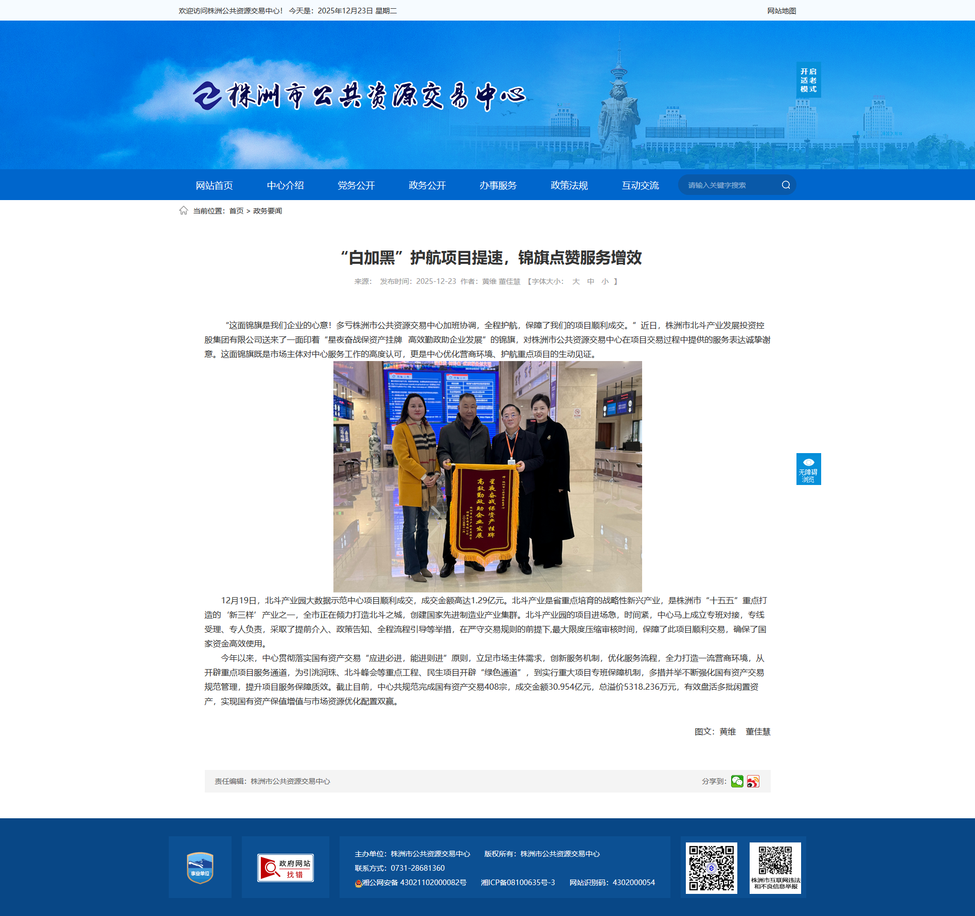 “这面锦旗是我们企业的心意!多亏株洲市公共资源交易中心加班协调,全程护航,保障了我们的项目顺利成交。”近日,株洲市北斗产业发展投资控股集团有限公司送来了一面印着“星夜奋战保资产挂牌 高效勤政助企业发展”的锦旗,对株洲市公共资源交易中心在项目交易过程中提供的服务表达诚挚谢意。这面锦旗既是市场主体对中心服务工作的高度认可,更是中心优化营商环境、护航重点项目的生动见证。