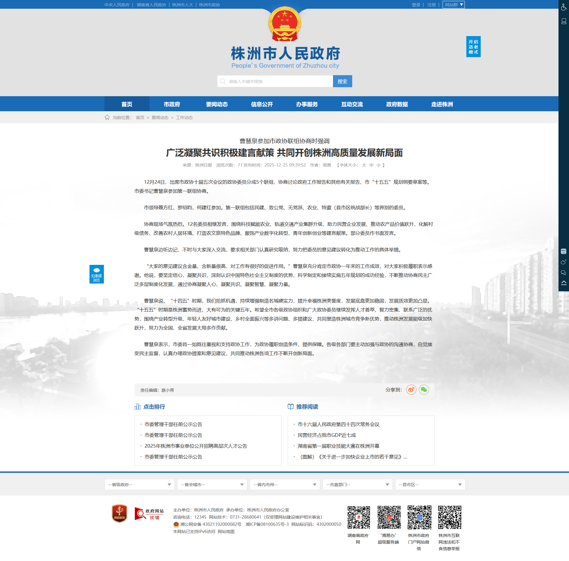 曹慧泉说,“十四五”时期,我们抢抓机遇,持续增强制造名城硬实力,提升幸福株洲美誉度,发展底盘更加稳固,发展质效更加凸显。“十五五”时期是株洲蓄势而进、大有可为的关键五年。希望全市各级政协组织和广大政协委员继续发挥人才荟萃、智力密集、联系广泛的优势,围绕产业转型升级、年轻人友好城市建设、乡村全面振兴等多讲问题、多提建议,共同塑造株洲城市竞争新优势,推动株洲发展能级加快跃升,努力为全国、全省发展大局多作贡献。