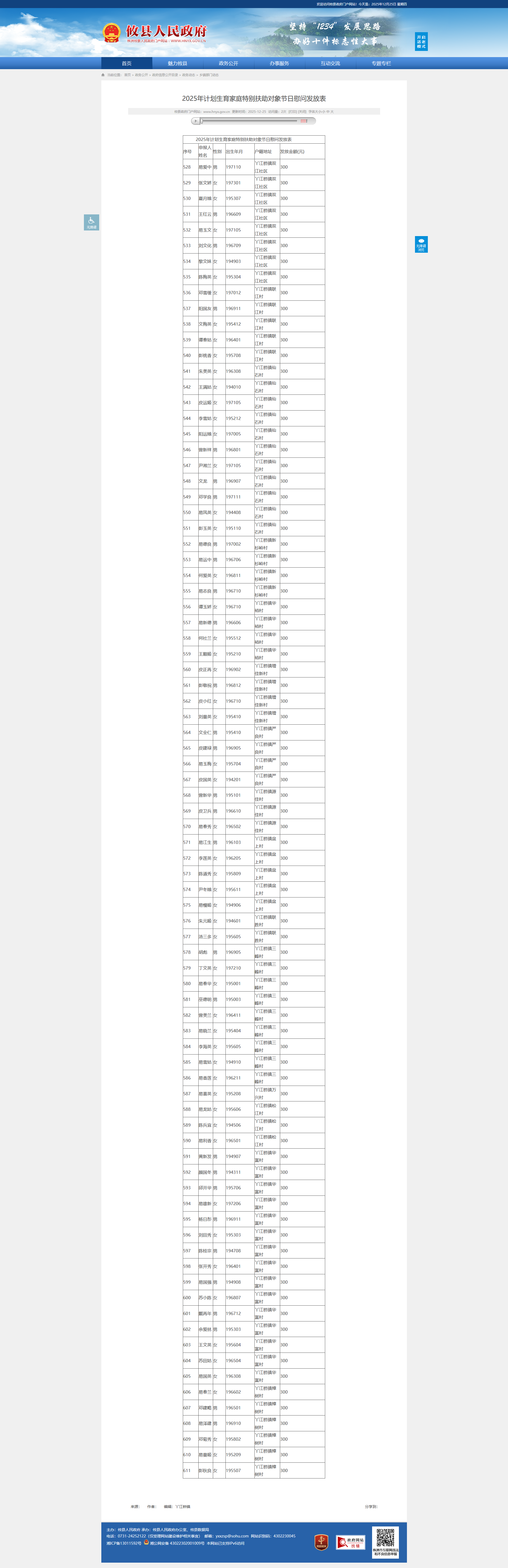 | 570 | 易春秀 | 女 | 196502 | 丫江桥镇源佳村 | 300 |