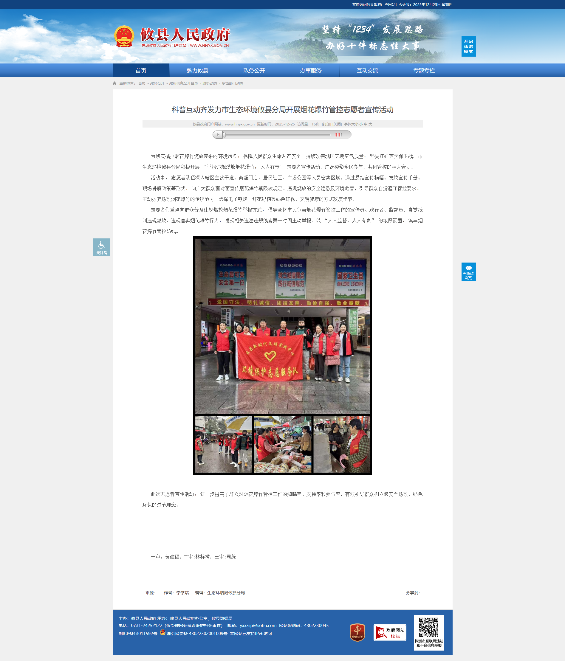 为切实减少烟花爆竹燃放带来的环境污染,保障人民群众生命财产安全,持续改善城区环境空气质量,坚决打好蓝天保卫战,市生态环境攸县分局积极开展 “举报违规燃放烟花爆竹,人人有责” 志愿者宣传活动,广泛凝聚全民参与、共同管控的强大合力。