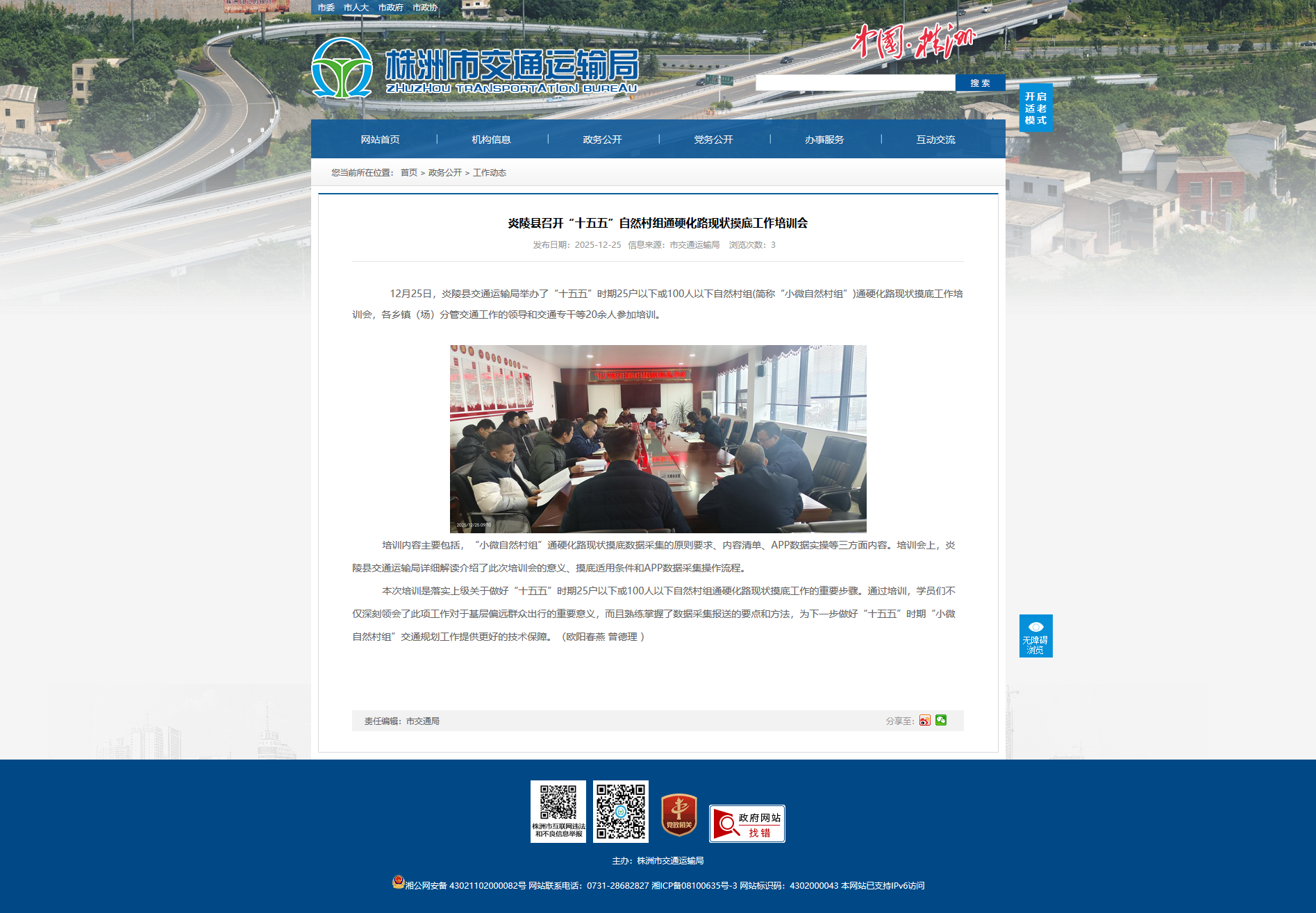 培训内容主要包括,“小微自然村组”通硬化路现状摸底数据采集的原则要求、内容清单、APP数据实操等三方面内容。培训会上,炎陵县交通运输局详细解读介绍了此次培训会的意义、摸底适用条件和APP数据采集操作流程。本次培训是落实上级关于做好“十五五”时期25户以下或100人以下自然村组通硬化路现状摸底工作的重要步骤。通过培训,学员们不仅深刻领会了此项工作对于基层偏远群众出行的重要意义,而且熟练掌握了数据采集报送的要点和方法,为下一步做好“十五五”时期“小微自然村组”交通规划工作提供更好的技术保障。(欧阳春燕 曾德理 )