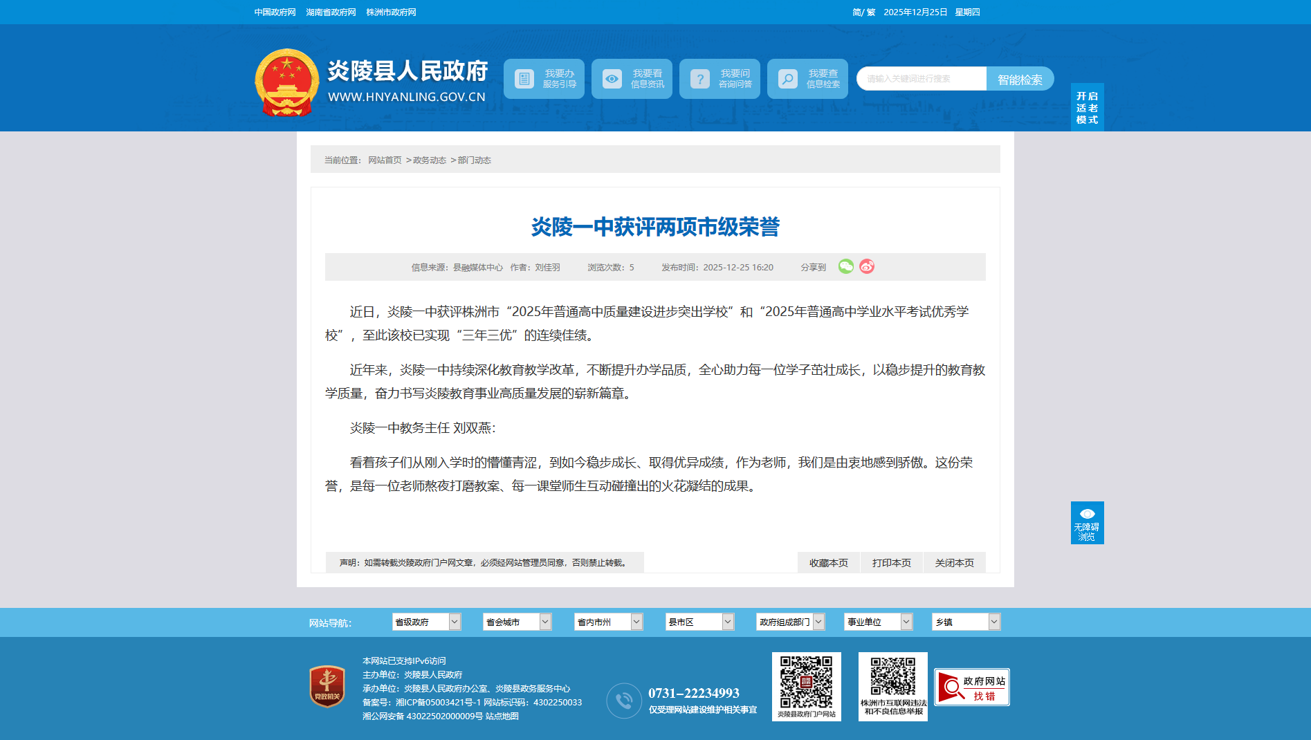 近日,炎陵一中获评株洲市“2025年普通高中质量建设进步突出学校”和“2025年普通高中学业水平考试优秀学校”,至此该校已实现“三年三优”的连续佳绩。