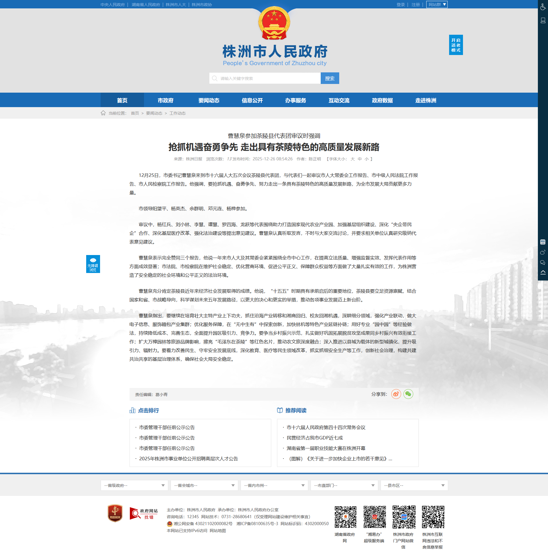 12月25日,市委书记曹慧泉来到市十六届人大五次会议茶陵县代表团,与代表们一起审议市人大常委会工作报告、市中级人民法院工作报告、市人民检察院工作报告。他强调,要抢抓机遇、奋勇争先,努力走出一条具有茶陵特色的高质量发展新路,为全市发展大局贡献更多力量。