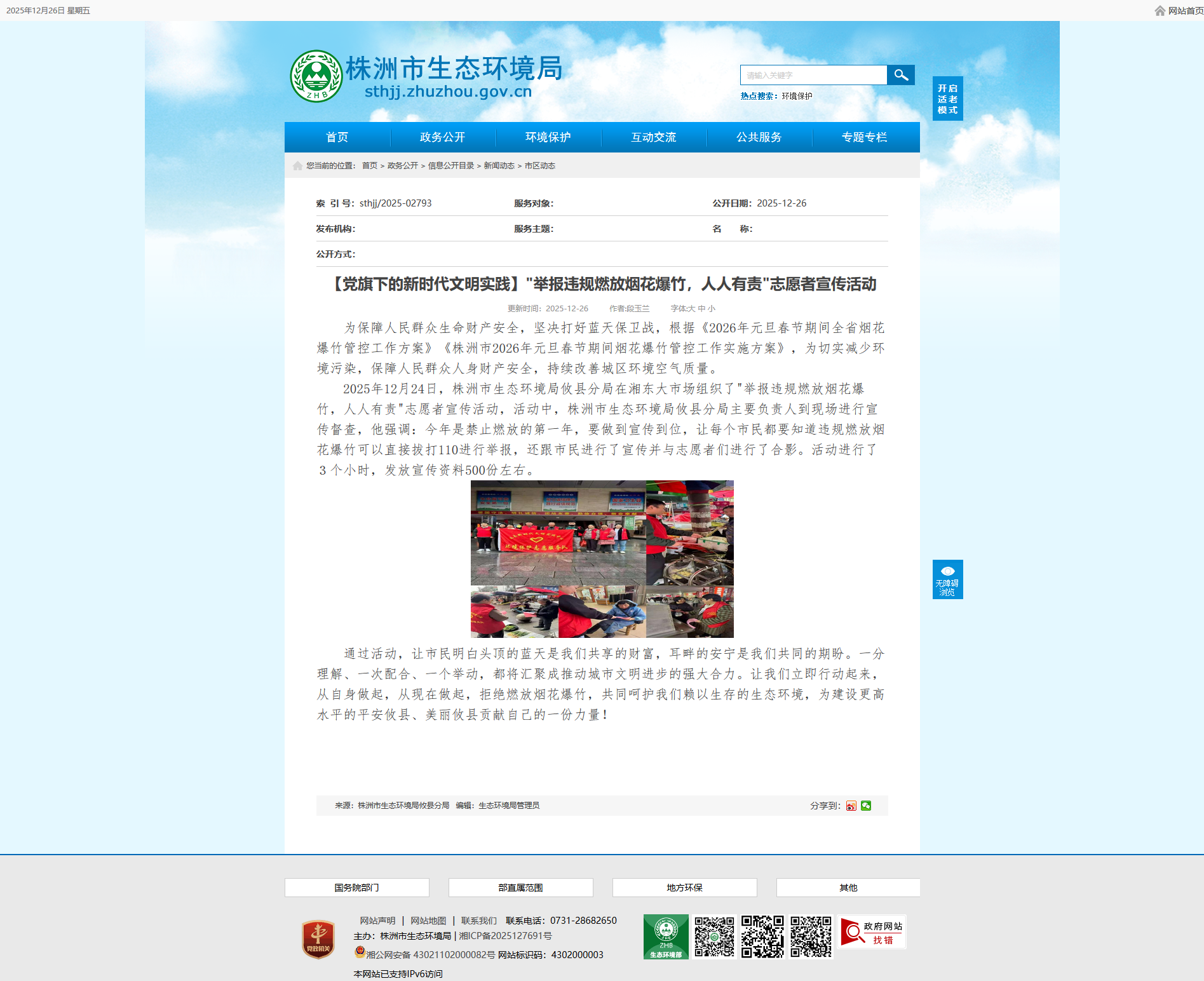2025年12月24日,株洲市生态环境局攸县分局在湘东大市场组织了"举报违规燃放烟花爆竹,人人有责"志愿者宣传活动,活动中,株洲市生态环境局攸县分局主要负责人到现场进行宣传督查,他强调:今年是禁止燃放的第一年,要做到宣传到位,让每个市民都要知道违规燃放烟花爆竹可以直接拔打110进行举报,还跟市民进行了宣传并与志愿者们进行了合影。活动进行了3个小时,发放宣传资料500份左右。