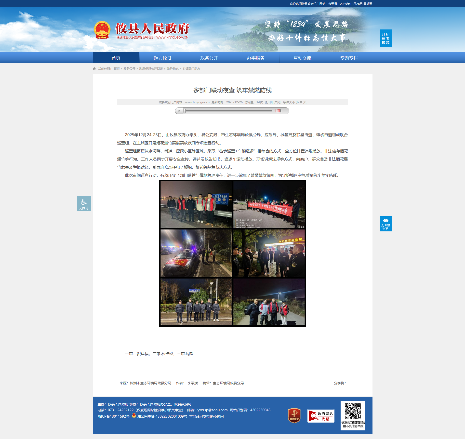 2025年12月24-25日,由攸县政府办牵头,县公安局、市生态环境局攸县分局、应急局、城管局及联星街道、谭桥街道组成联合巡查组,在主城区开展烟花爆竹禁燃禁放夜间专项巡查行动。