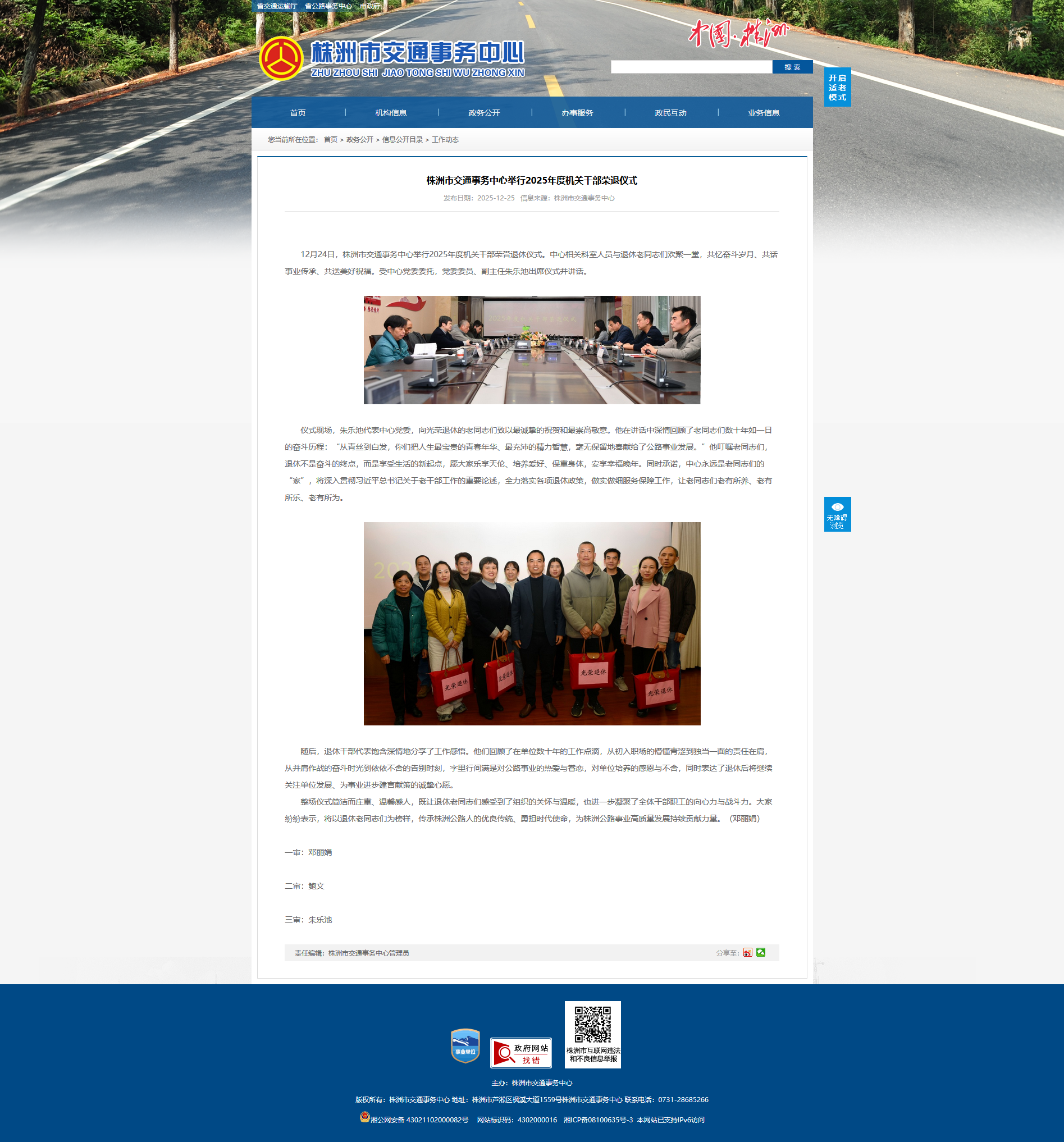 12月24日,株洲市交通事务中心举行2025年度机关干部荣誉退休仪式。中心相关科室人员与退休老同志们欢聚一堂,共忆奋斗岁月、共话事业传承、共送美好祝福。受中心党委委托,党委委员、副主任朱乐池出席仪式并讲话。