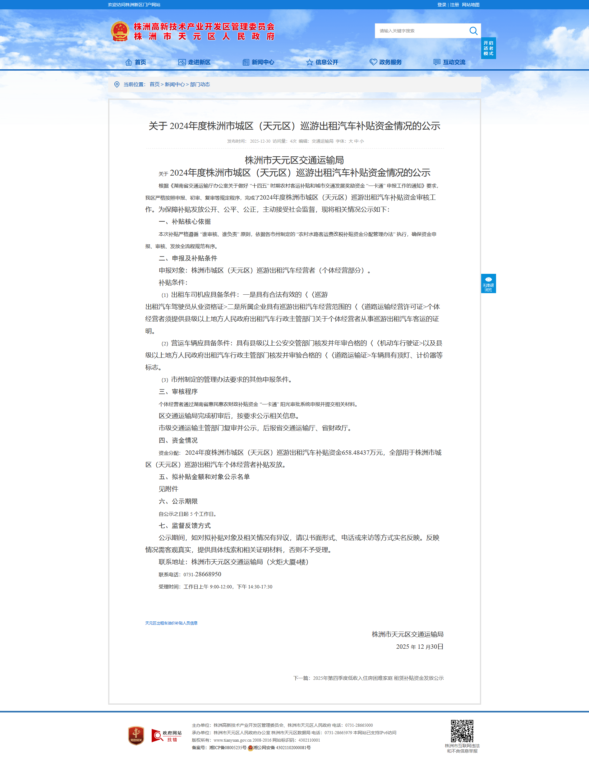 根据《湖南省交通运输厅办公室关于做好 “十四五” 时期农村客运补贴和城市交通发展奖励资金 “一卡通” 申报工作的通知》要求,我区严格按照申报、初审、复审等规定程序,完成了2024年度株洲市城区(天元区)巡游出租汽车补贴资金审核工作。为保障补贴发放公开、公平、公正,主动接受社会监督,现将相关情况公示如下: