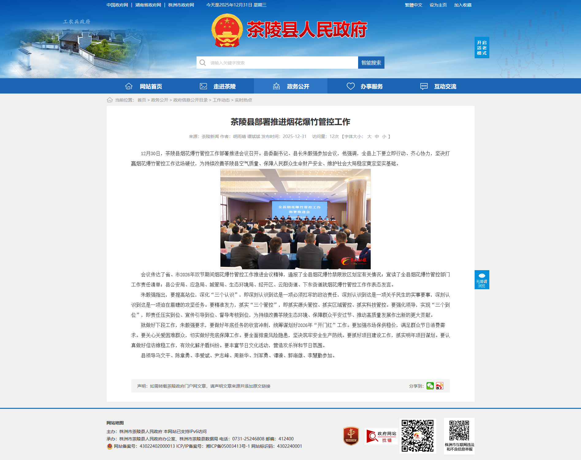 12月30日,茶陵县烟花爆竹管控工作部署推进会议召开。县委副书记、县长朱毅强参加会议,他强调,全县上下要立即行动、齐心协力,坚决打赢烟花爆竹管控工作这场硬仗,为持续改善茶陵县空气质量、保障人民群众生命财产安全、维护社会大局稳定奠定坚实基础。