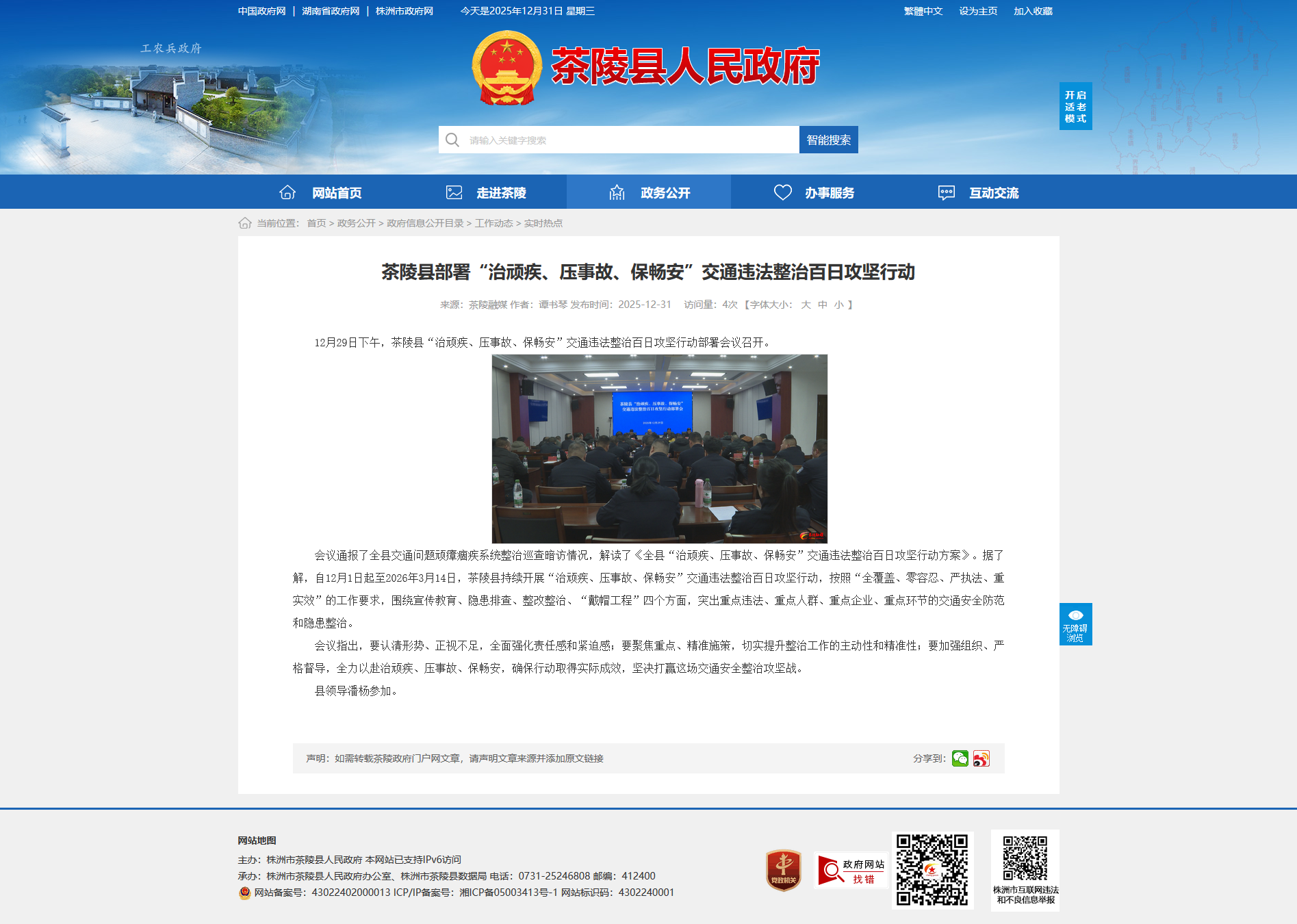 会议通报了全县交通问题顽瘴痼疾系统整治巡查暗访情况,解读了《全县“治顽疾、压事故、保畅安”交通违法整治百日攻坚行动方案》。据了解,自12月1日起至2026年3月14日,茶陵县持续开展“治顽疾、压事故、保畅安”交通违法整治百日攻坚行动,按照“全覆盖、零容忍、严执法、重实效”的工作要求,围绕宣传教育、隐患排查、整改整治、“戴帽工程”四个方面,突出重点违法、重点人群、重点企业、重点环节的交通安全防范和隐患整治。