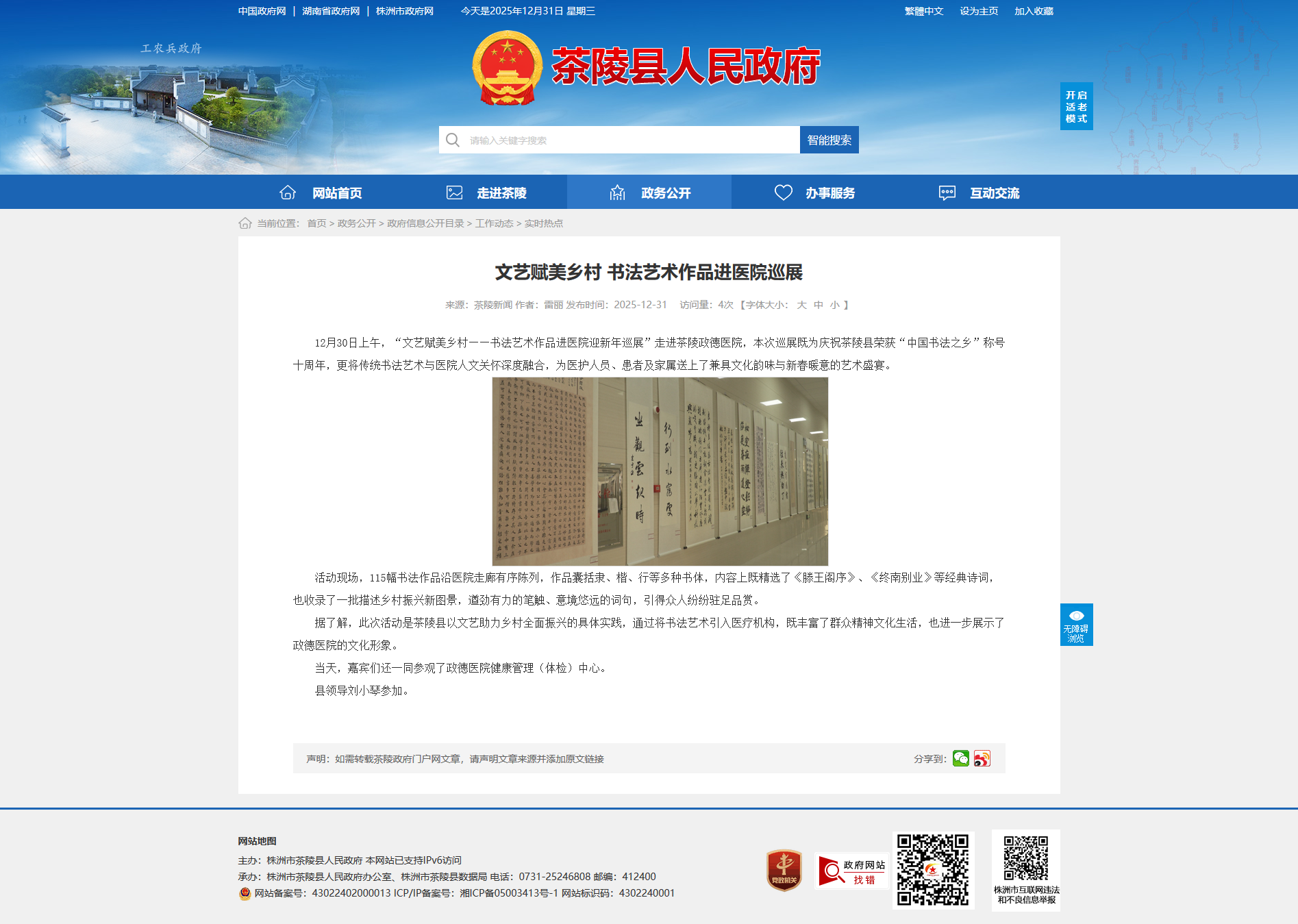 12月30日上午,“文艺赋美乡村——书法艺术作品进医院迎新年巡展”走进茶陵政德医院,本次巡展既为庆祝茶陵县荣获“中国书法之乡”称号十周年,更将传统书法艺术与医院人文关怀深度融合,为医护人员、患者及家属送上了兼具文化韵味与新春暖意的艺术盛宴。