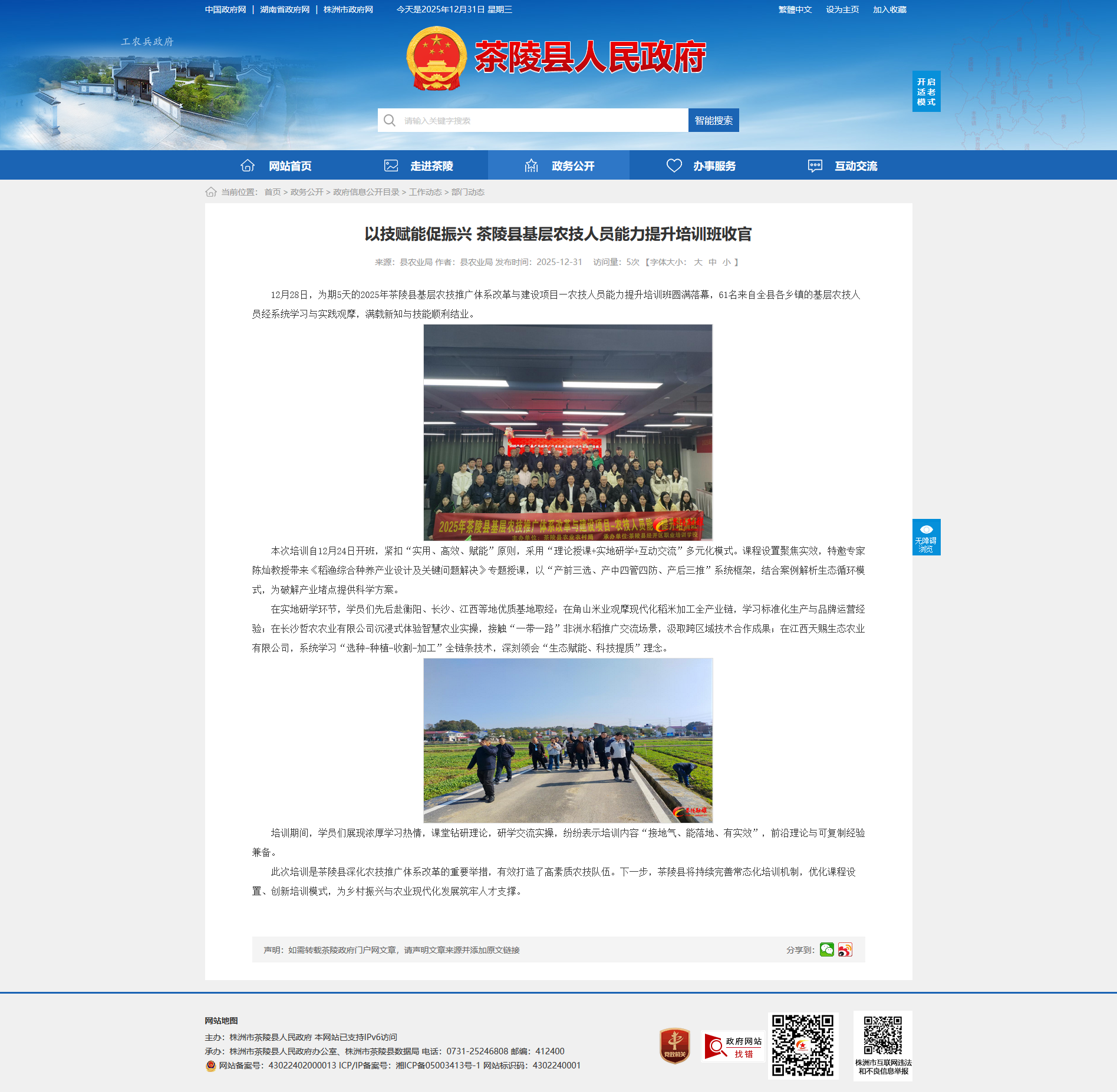 12月28日,为期5天的2025年茶陵县基层农技推广体系改革与建设项目—农技人员能力提升培训班圆满落幕,61名来自全县各乡镇的基层农技人员经系统学习与实践观摩,满载新知与技能顺利结业。