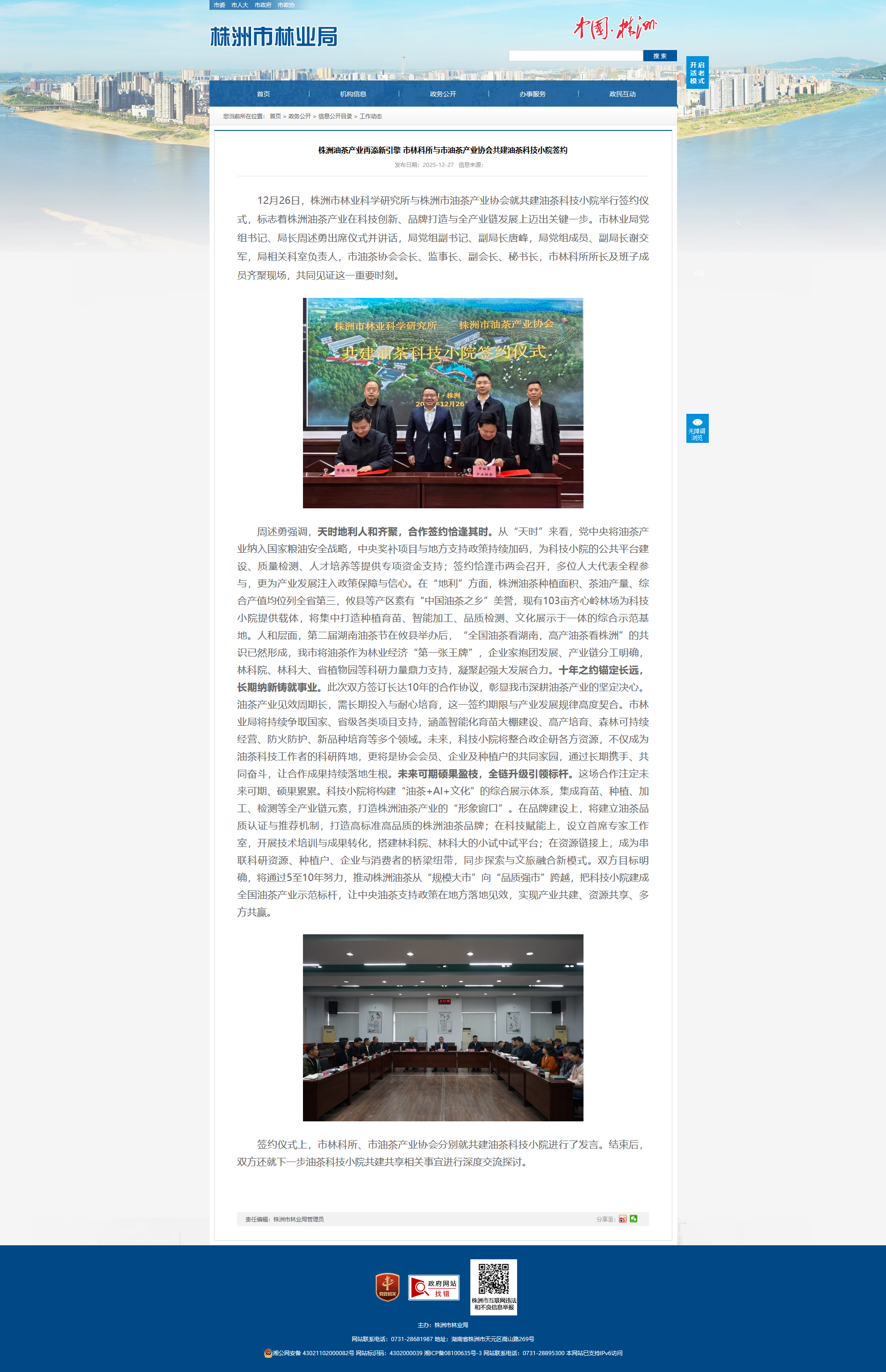周述勇强调,天时地利人和齐聚,合作签约恰逢其时。从“天时”来看,党中央将油茶产业纳入国家粮油安全战略,中央奖补项目与地方支持政策持续加码,为科技小院的公共平台建设、质量检测、人才培养等提供专项资金支持;签约恰逢市两会召开,多位人大代表全程参与,更为产业发展注入政策保障与信心。在“地利”方面,株洲油茶种植面积、茶油产量、综合产值均位列全省第三,攸县等产区素有“中国油茶之乡”美誉,现有103亩齐心岭林场为科技小院提供载体,将集中打造种植育苗、智能加工、品质检测、文化展示于一体的综合示范基地。人和层面,第二届湖南油茶节在攸县举办后,“全国油茶看湖南,高产油茶看株洲”的共识已然形成,我市将油茶作为林业经济“第一张王牌”,企业家抱团发展、产业链分工明确,林科院、林科大、省植物园等科研力量鼎力支持,凝聚起强大发展合力。十年之约锚定长远,长期纳新铸就事业。此次双方签订长达10年的合作协议,彰显我市深耕油茶产业的坚定决心。油茶产业见效周期长,需长期投入与耐心培育,这一签约期限与产业发展规律高度契合。市林业局将持续争取国家、省级各类项目支持,涵盖智能化育苗大棚建设、高产培育、森林可持续经营、防火防护、新品种培育等多个领域。未来,科技小院将整合政企研各方资源,不仅成为油茶科技工作者的科研阵地,更将是协会会员、企业及种植户的共同家园,通过长期携手、共同奋斗,让合作成果持续落地生根。未来可期硕果盈枝,全链升级引领标杆。这场合作注定未来可期、硕果累累。科技小院将构建“油茶 AI 文化”的综合展示体系,集成育苗、种植、加工、检测等全产业链元素,打造株洲油茶产业的“形象窗口”。在品牌建设上,将建立油茶品质认证与推荐机制,打造高标准高品质的株洲油茶品牌;在科技赋能上,设立首席专家工作室,开展技术培训与成果转化,搭建林科院、林科大的小试中试平台;在资源链接上,成为串联科研资源、种植户、企业与消费者的桥梁纽带,同步探索与文旅融合新模式。双方目标明确,将通过5至10年努力,推动株洲油茶从“规模大市”向“品质强市”跨越,把科技小院建成全国油茶产业示范标杆,让中央油茶支持政策在地方落地见效,实现产业共建、资源共享、多方共赢。
