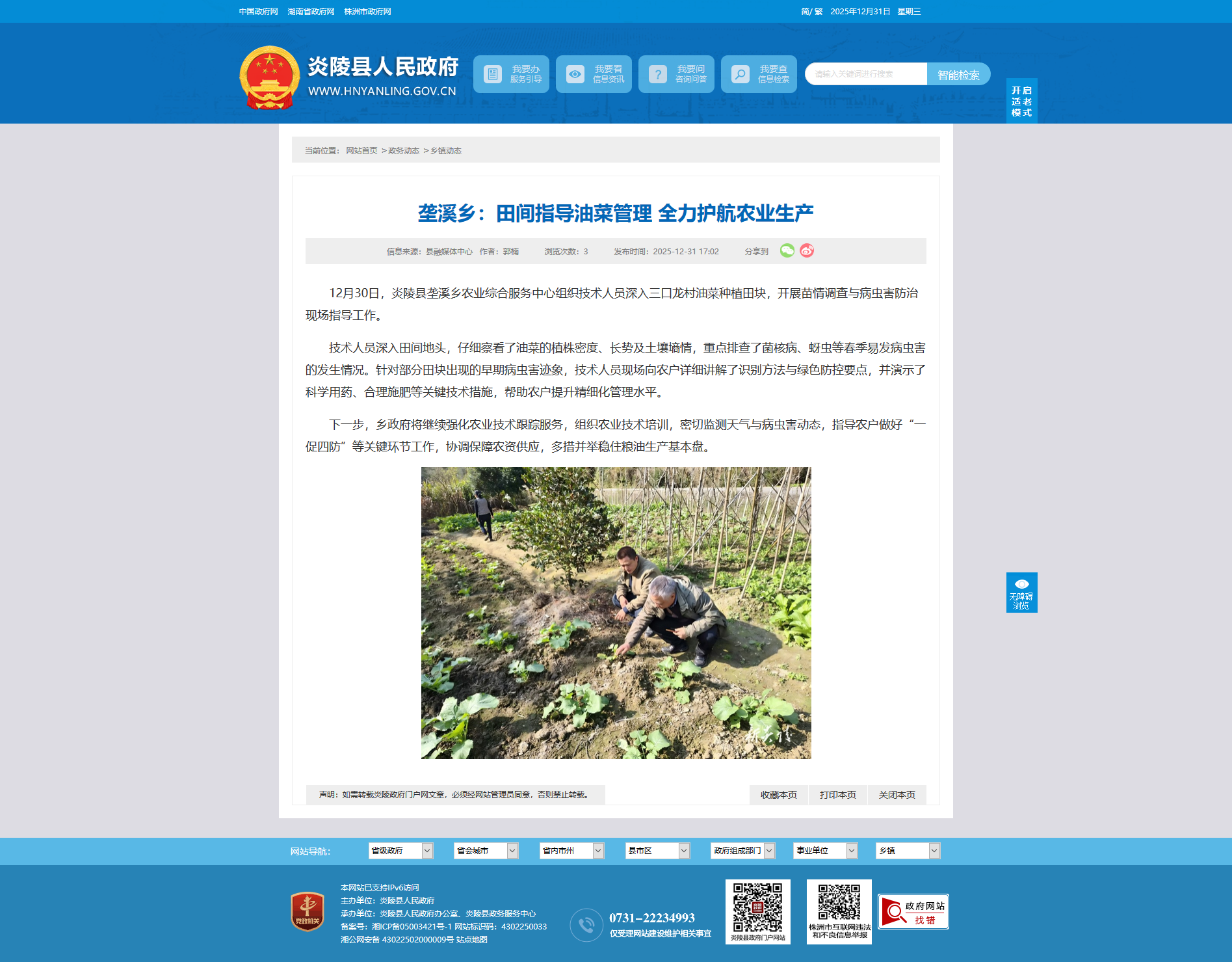 12月30日,炎陵县垄溪乡农业综合服务中心组织技术人员深入三口龙村油菜种植田块,开展苗情调查与病虫害防治现场指导工作。