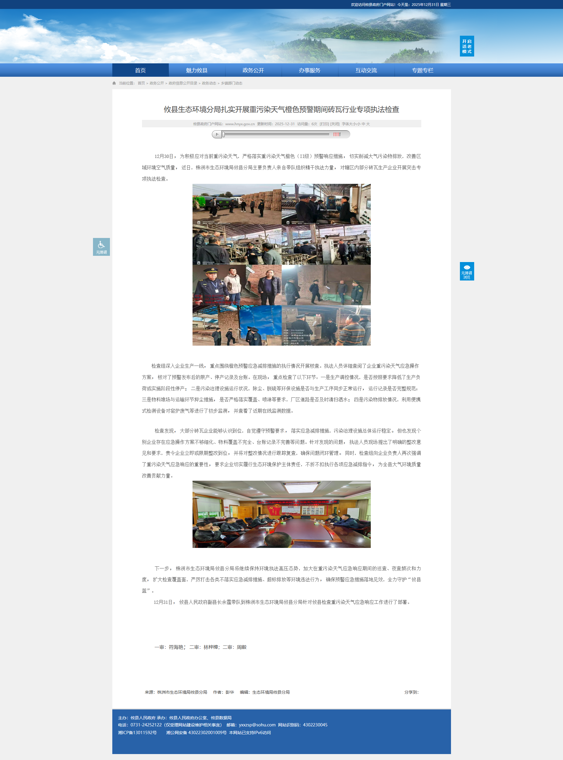 12月30日,为积极应对当前重污染天气,严格落实重污染天气橙色(II级)预警响应措施,切实削减大气污染物排放,改善区域环境空气质量,近日,株洲市生态环境局攸县分局主要负责人亲自带队组织精干执法力量,对辖区内部分砖瓦生产企业开展突击专项执法检查。