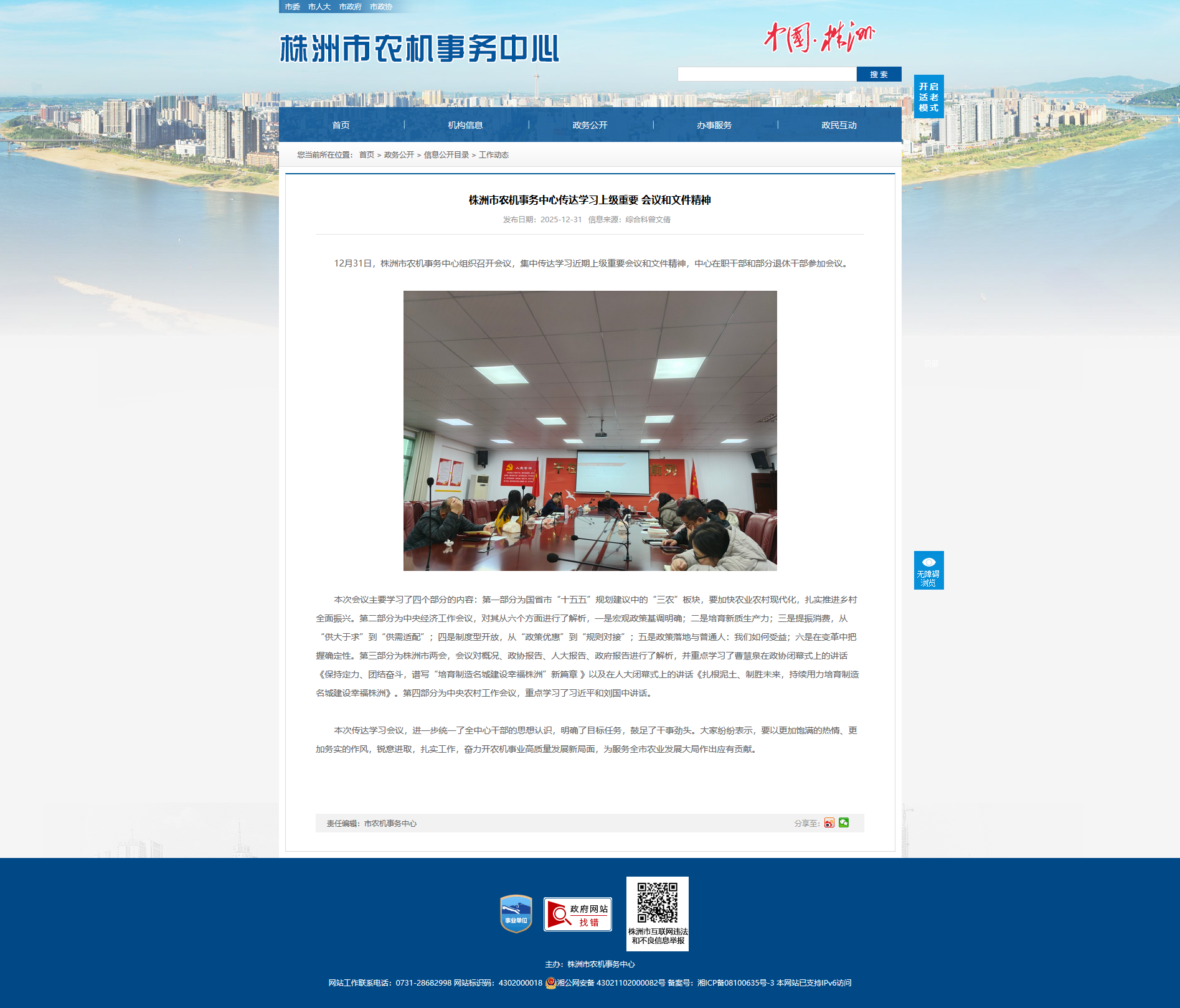 12月31日,株洲市农机事务中心组织召开会议,集中传达学习近期上级重要会议和文件精神,中心在职干部和部分退休干部参加会议。