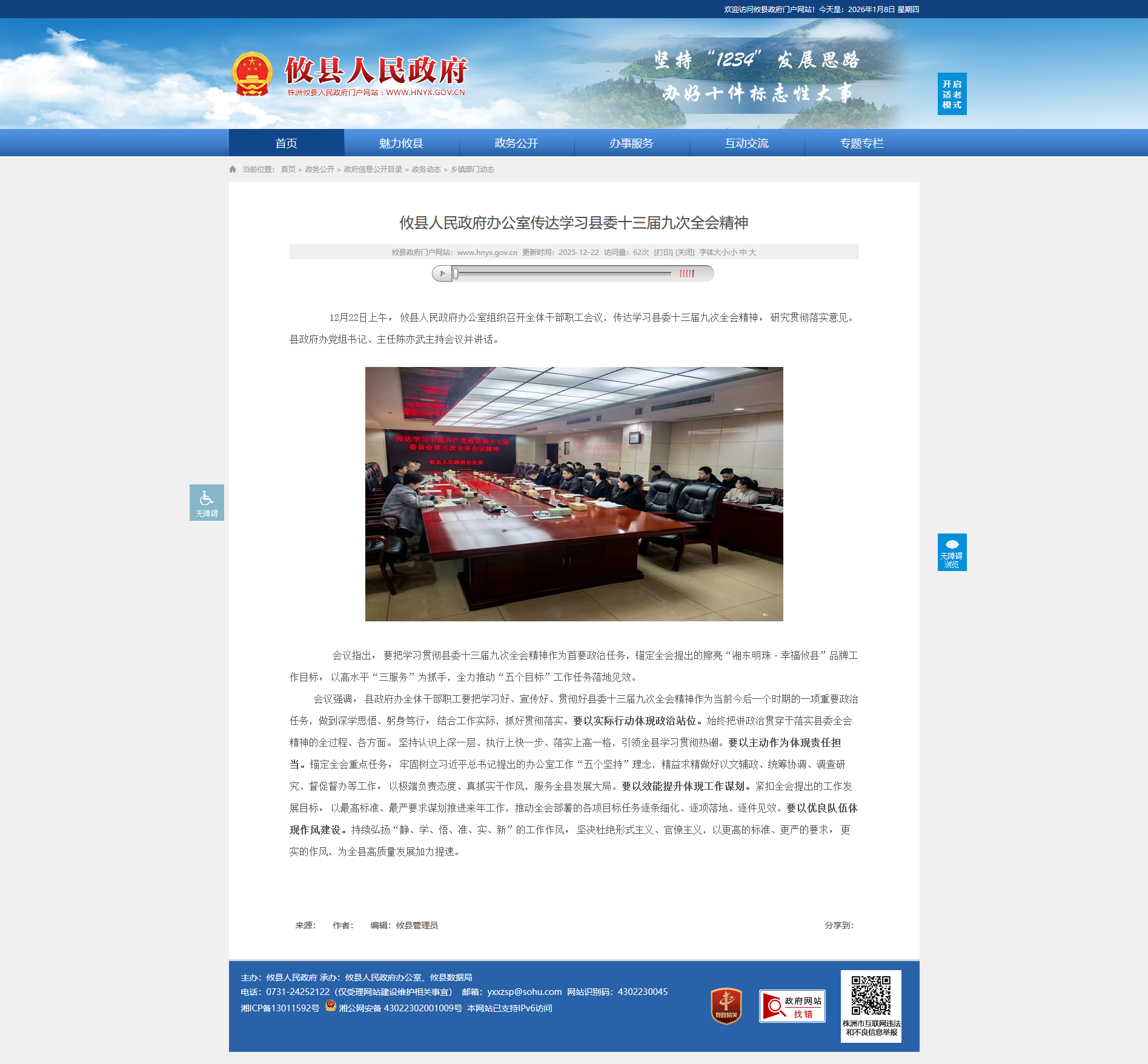 会议强调,县政府办全体干部职工要把学习好、宣传好、贯彻好县委十三届九次全会精神作为当前今后一个时期的一项重要政治任务,做到深学思悟、躬身笃行,结合工作实际,抓好贯彻落实。要以实际行动体现政治站位。始终把讲政治贯穿于落实县委全会精神的全过程、各方面。坚持认识上深一层、执行上快一步、落实上高一格,引领全县学习贯彻热潮。要以主动作为体现责任担当。锚定全会重点任务,牢固树立习近平总书记提出的办公室工作“五个坚持”理念,精益求精做好以文辅政、统筹协调、调查研究、督促督办等工作,以极端负责态度、真抓实干作风,服务全县发展大局。要以效能提升体现工作谋划。紧扣全会提出的工作发展目标,以最高标准、最严要求谋划推进来年工作,推动全会部署的各项目标任务逐条细化、逐项落地、逐件见效。要以优良队伍体现作风建设。持续弘扬“静、学、悟、准、实、新”的工作作风,坚决杜绝形式主义、官僚主义,以更高的标准、更严的要求,更实的作风,为全县高质量发展加力提速。