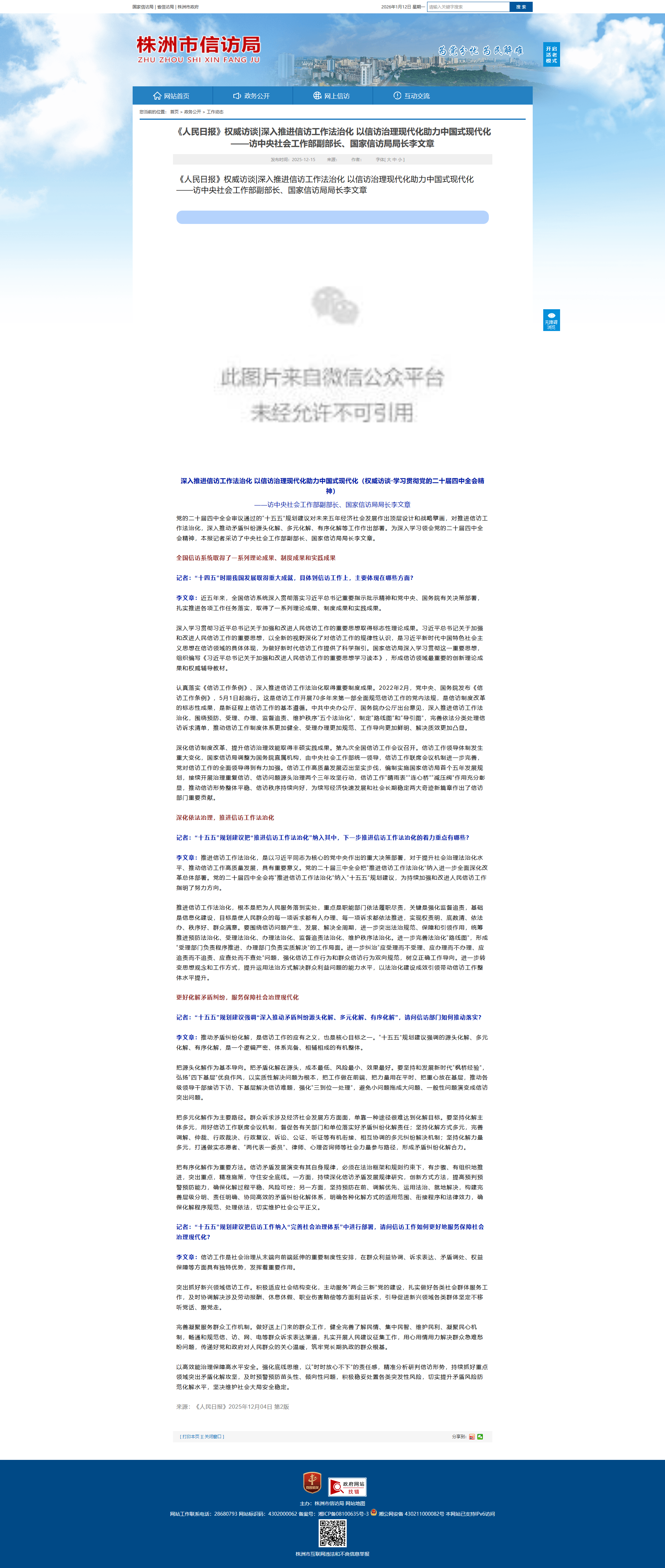 深入推进信访工作法治化 以信访治理现代化助力中国式现代化(权威访谈·学习贯彻党的二十届四中全会精神) ——访中央社会工作部副部长、国家信访局局长李文章 党的二十届四中全会审议通过的“十五五”规划建议对未来五年经济社会发展作出顶层设计和战略擘画,对推进信访工作法治化,深入推动矛盾纠纷源头化解、多元化解、有序化解等工作作出部署。为深入学习领会党的二十届四中全会精神,本报记者采访了中央社会工作部副部长、国家信访局局长李文章。 全国信访系统取得了一系列理论成果、制度成果和实践成果 记者:“十四五”时期我国发展取得重大成就,具体到信访工作上,主要体现在哪些方面? 李文章:近五年来,全国信访系统深入贯彻落实习近平总书记重要指示批示精神和党中央、国务院有关决策部署,扎实推进各项工作任务落实,取得了一系列理论成果、制度成果和实践成果。 深入学习贯彻习近平总书记关于加强和改进人民信访工作的重要思想取得标志性理论成果。习近平总书记关于加强和改进人民信访工作的重要思想,以全新的视野深化了对信访工作的规律性认识,是习近平新时代中国特色社会主义思想在信访领域的具体体现,为做好新时代信访工作提供了科学指引。国家信访局深入学习贯彻这一重要思想,组织编写《习近平总书记关于加强和改进人民信访工作的重要思想学习读本》,形成信访领域最重要的创新理论成果和权威辅导教材。 认真落实《信访工作条例》、深入推进信访工作法治化取得重要制度成果。2022年2月,党中央、国务院发布《信访工作条例》,5月1日起施行。这是信访工作开展70多年来第一部全面规范信访工作的党内法规,是信访制度改革的标志性成果,是新征程上信访工作的基本遵循。中共中央办公厅、国务院办公厅出台意见,深入推进信访工作法治化,围绕预防、受理、办理、监督追责、维护秩序“五个法治化”,制定“路线图”和“导引图”,完善依法分类处理信访诉求清单,推动信访工作制度体系更加健全、受理办理更加规范、工作导向更加鲜明、解决质效更加凸显。 深化信访制度改革、提升信访治理效能取得丰硕实践成果。第九次全国信访工作会议召开。信访工作领导体制发生重大变化,国家信访局调整为国务院直属机构,由中央社会工作部统一领导,信访工作联席会议机制进一步完善,党对信访工作的全面领导得到有力加强。信访工作高质量发展迈出坚实步伐,编制实施国家信访局首个五年发展规划,接续开展治理重复信访、信访问题源头治理两个三年攻坚行动,信访工作“晴雨表”“连心桥”“减压阀”作用充分彰显,推动信访形势整体平稳、信访秩序持续向好,为续写经济快速发展和社会长期稳定两大奇迹新篇章作出了信访部门重要贡献。 深化依法治理,推进信访工作法治化 记者:“十五五”规划建议把“推进信访工作法治化”纳入其中,下一步推进信访工作法治化的着力重点有哪些? 李文章:推进信访工作法治化,是以习近平同志为核心的党中央作出的重大决策部署,对于提升社会治理法治化水平、推动信访工作高质量发展,具有重要意义。党的二十届三中全会把“推进信访工作法治化”纳入进一步全面深化改革总体部署。党的二十届四中全会将“推进信访工作法治化”纳入“十五五”规划建议,为持续加强和改进人民信访工作指明了努力方向。 推进信访工作法治化,根本是把为人民服务落到实处,重点是职能部门依法履职尽责,关键是强化监督追责,基础是信息化建设,目标是使人民群众的每一项诉求都有人办理、每一项诉求都依法推进,实现权责明、底数清、依法办、秩序好、群众满意。要围绕信访问题产生、发展、解决全周期,进一步突出法治规范、保障和引领作用,统筹推进预防法治化、受理法治化、办理法治化、监督追责法治化、维护秩序法治化。进一步完善法治化“路线图”,形成“受理部门负责程序推进、办理部门负责实质解决”的工作局面。进一步纠治“应受理而不受理、应办理而不办理、应追责而不追责、应查处而不查处”问题,强化信访工作行为和群众信访行为双向规范,树立正确工作导向。进一步转变思想观念和工作方式,提升运用法治方式解决群众利益问题的能力水平,以法治化建设成效引领带动信访工作整体水平提升。 更好化解矛盾纠纷,服务保障社会治理现代化 记者:“十五五”规划建议强调“深入推动矛盾纠纷源头化解、多元化解、有序化解”,请问信访部门如何推动落实? 李文章:推动矛盾纠纷化解,是信访工作的应有之义,也是核心目标之一。“十五五”规划建议强调的源头化解、多元化解、有序化解,是一个逻辑严密、体系完备、相辅相成的有机整体。 把源头化解作为基本导向。把矛盾化解在源头,成本最低、风险最小、效果最好。要坚持和发展新时代“枫桥经验”,弘扬“四下基层”优良作风,以实质性解决问题为根本,把工作做在前端、把力量用在平时、把重心放在基层,推动各级领导干部接访下访、下基层解决信访难题,强化“三到位一处理”,避免小问题拖成大问题、一般性问题演变成信访突出问题。 把多元化解作为主要路径。群众诉求涉及经济社会发展方方面面,单靠一种途径很难达到化解目标。要坚持化解主体多元,用好信访工作