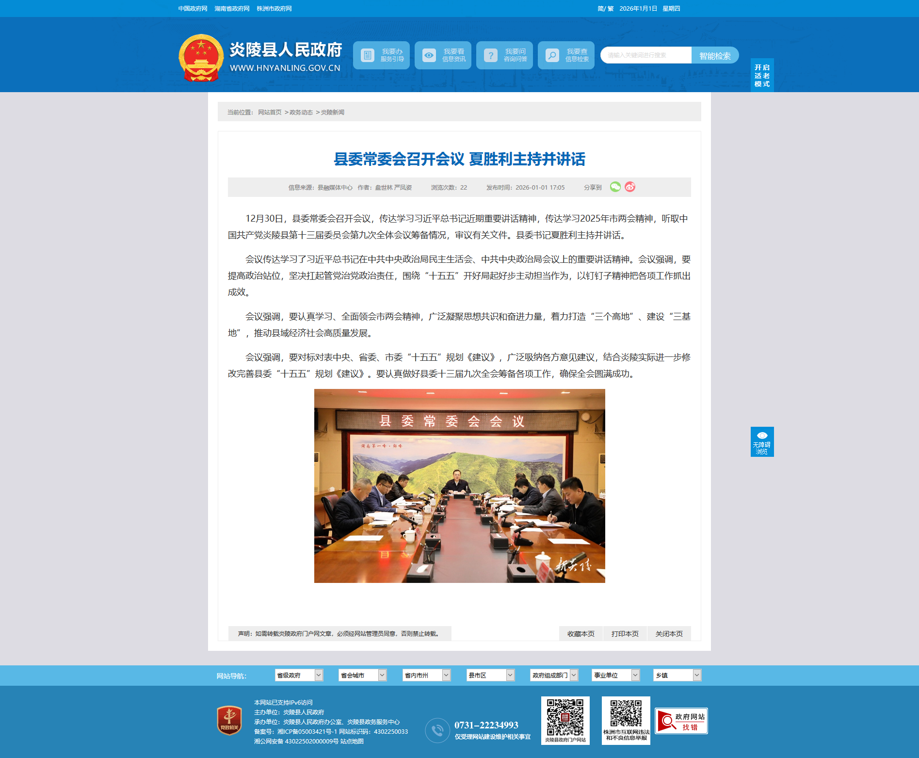 12月30日,县委常委会召开会议,传达学习习近平总书记近期重要讲话精神,传达学习2025年市两会精神,听取中国共产党炎陵县第十三届委员会第九次全体会议筹备情况,审议有关文件。县委书记夏胜利主持并讲话。