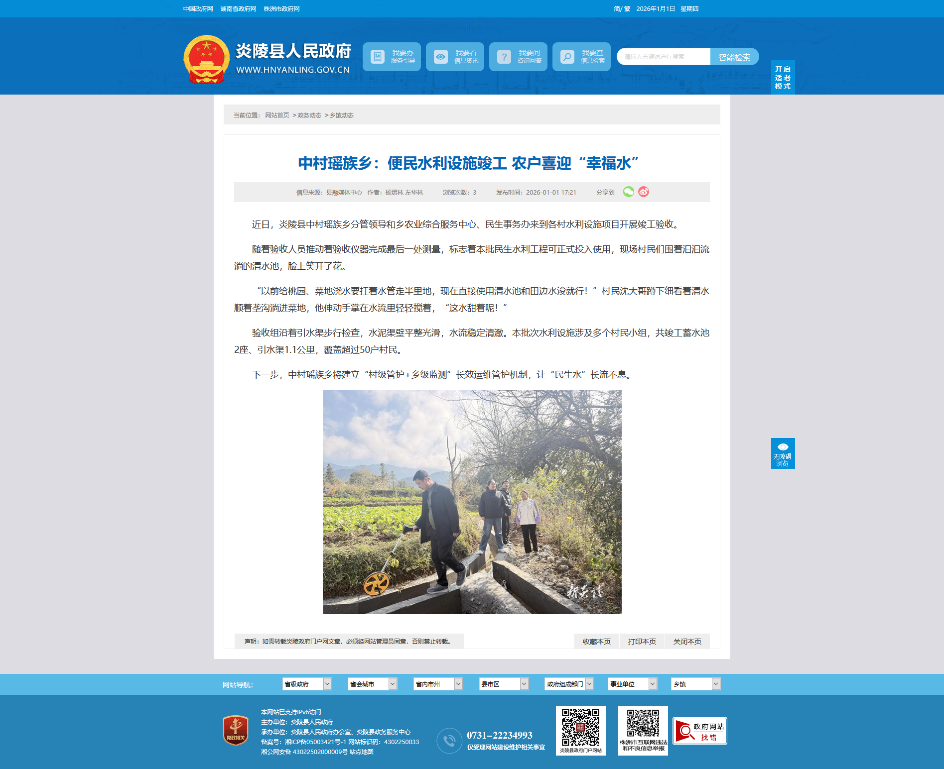 随着验收人员推动着验收仪器完成最后一处测量,标志着本批民生水利工程可正式投入使用,现场村民们围着汩汩流淌的清水池,脸上笑开了花。