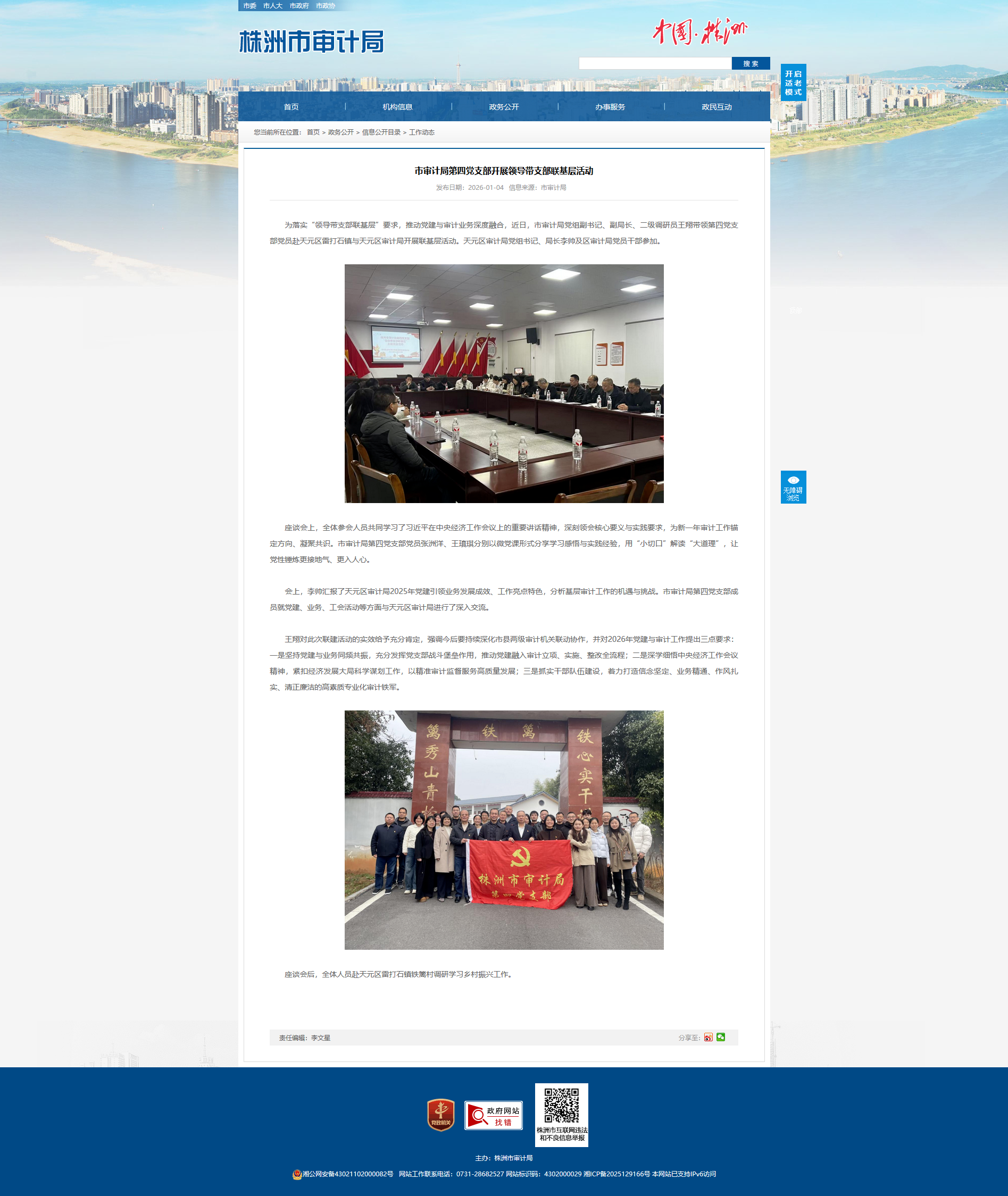 为落实“领导带支部联基层”要求,推动党建与审计业务深度融合,近日,市审计局党组副书记、副局长、二级调研员王翔带领第四党支部党员赴天元区雷打石镇与天元区审计局开展联基层活动。天元区审计局党组书记、局长李帅及区审计局党员干部参加。