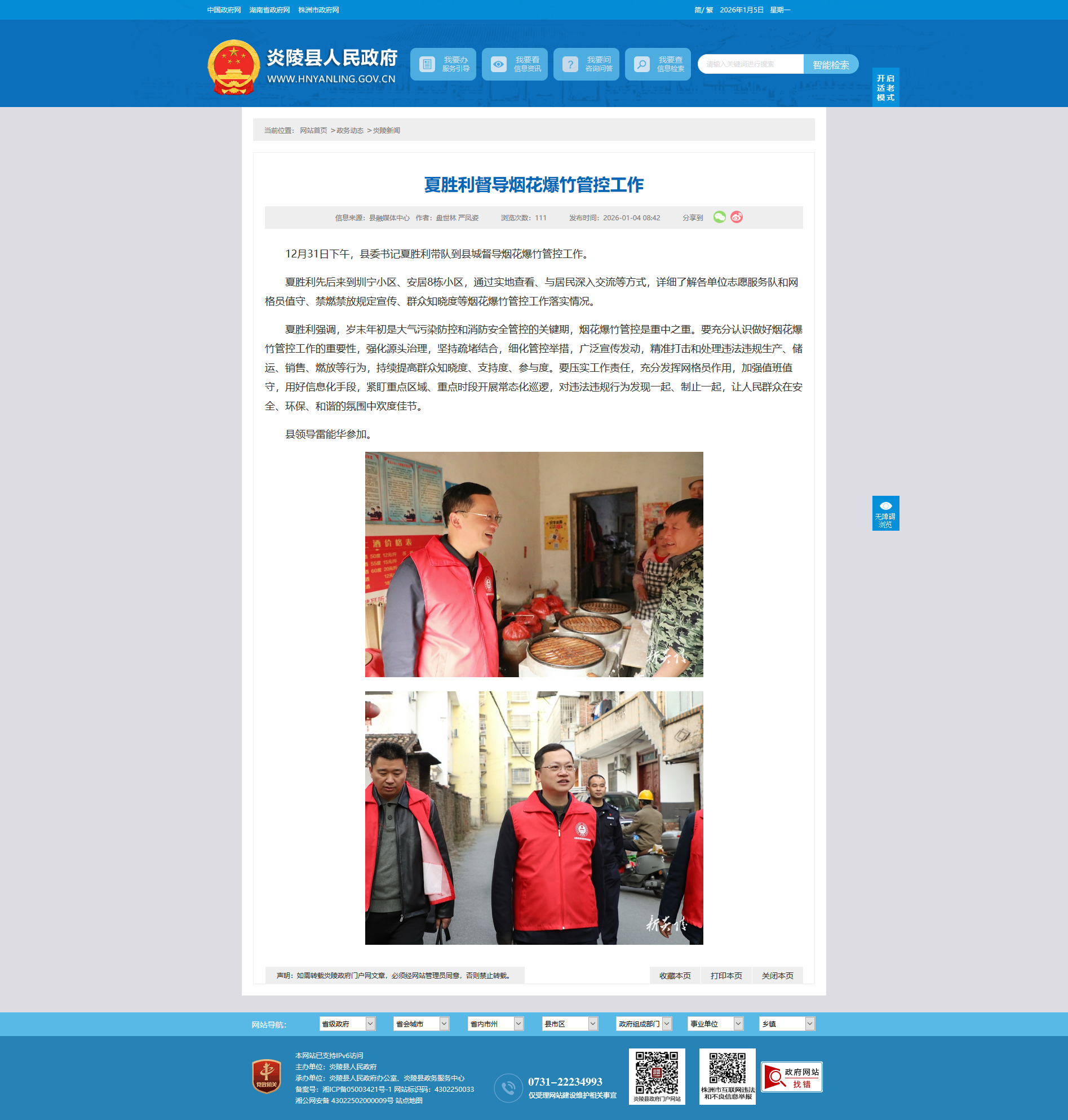 夏胜利强调,岁末年初是大气污染防控和消防安全管控的关键期,烟花爆竹管控是重中之重。要充分认识做好烟花爆竹管控工作的重要性,强化源头治理,坚持疏堵结合,细化管控举措,广泛宣传发动,精准打击和处理违法违规生产、储运、销售、燃放等行为,持续提高群众知晓度、支持度、参与度。要压实工作责任,充分发挥网格员作用,加强值班值守,用好信息化手段,紧盯重点区域、重点时段开展常态化巡逻,对违法违规行为发现一起、制止一起,让人民群众在安全、环保、和谐的氛围中欢度佳节。