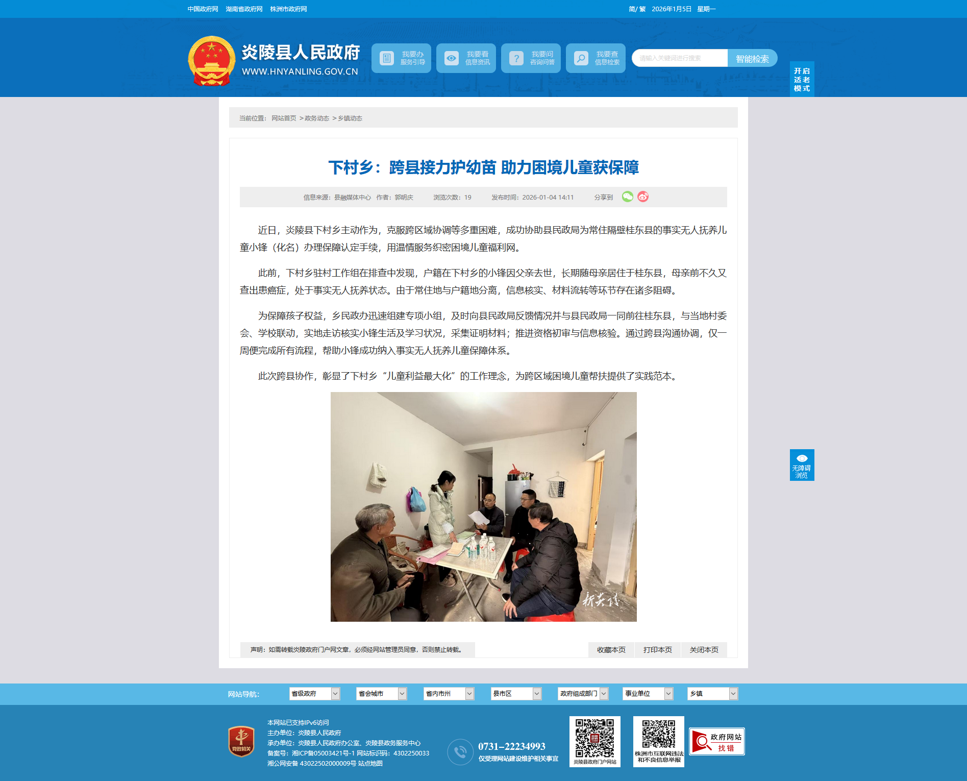 近日,炎陵县下村乡主动作为,克服跨区域协调等多重困难,成功协助县民政局为常住隔壁桂东县的事实无人抚养儿童小锋(化名)办理保障认定手续,用温情服务织密困境儿童福利网。