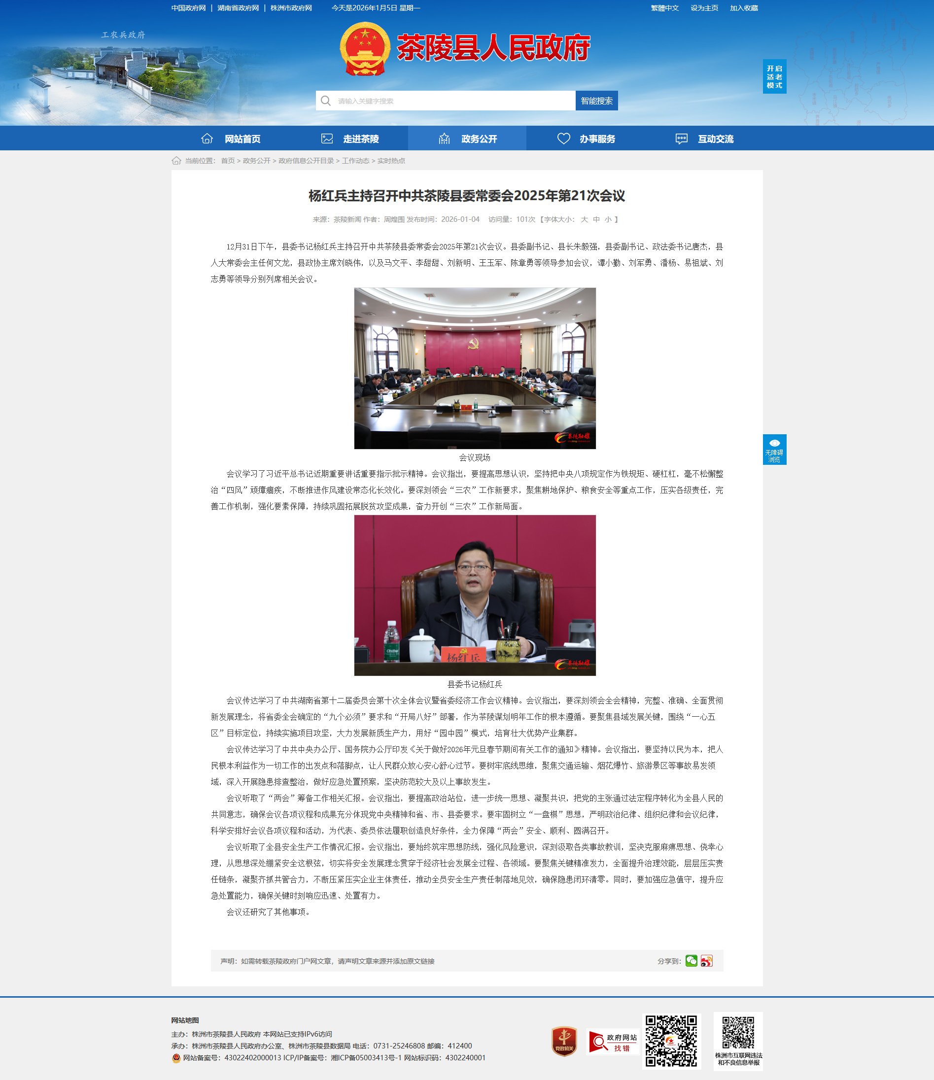12月31日下午,县委书记杨红兵主持召开中共茶陵县委常委会2025年第21次会议。县委副书记、县长朱毅强,县委副书记、政法委书记唐杰,县人大常委会主任何文龙,县政协主席刘晓伟,以及马文平、李甜甜、刘新明、王玉军、陈章勇等领导参加会议,谭小勤、刘军勇、潘杨、易祖斌、刘志勇等领导分别列席相关会议。