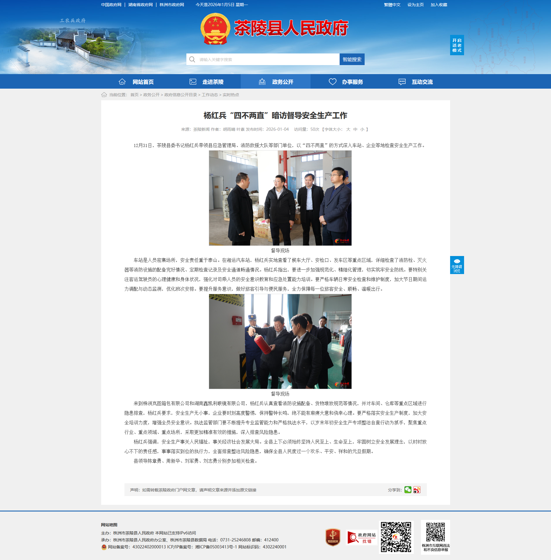 12月31日,茶陵县委书记杨红兵带领县应急管理局、消防救援大队等部门单位,以“四不两直”的方式深入车站、企业等地检查安全生产工作。