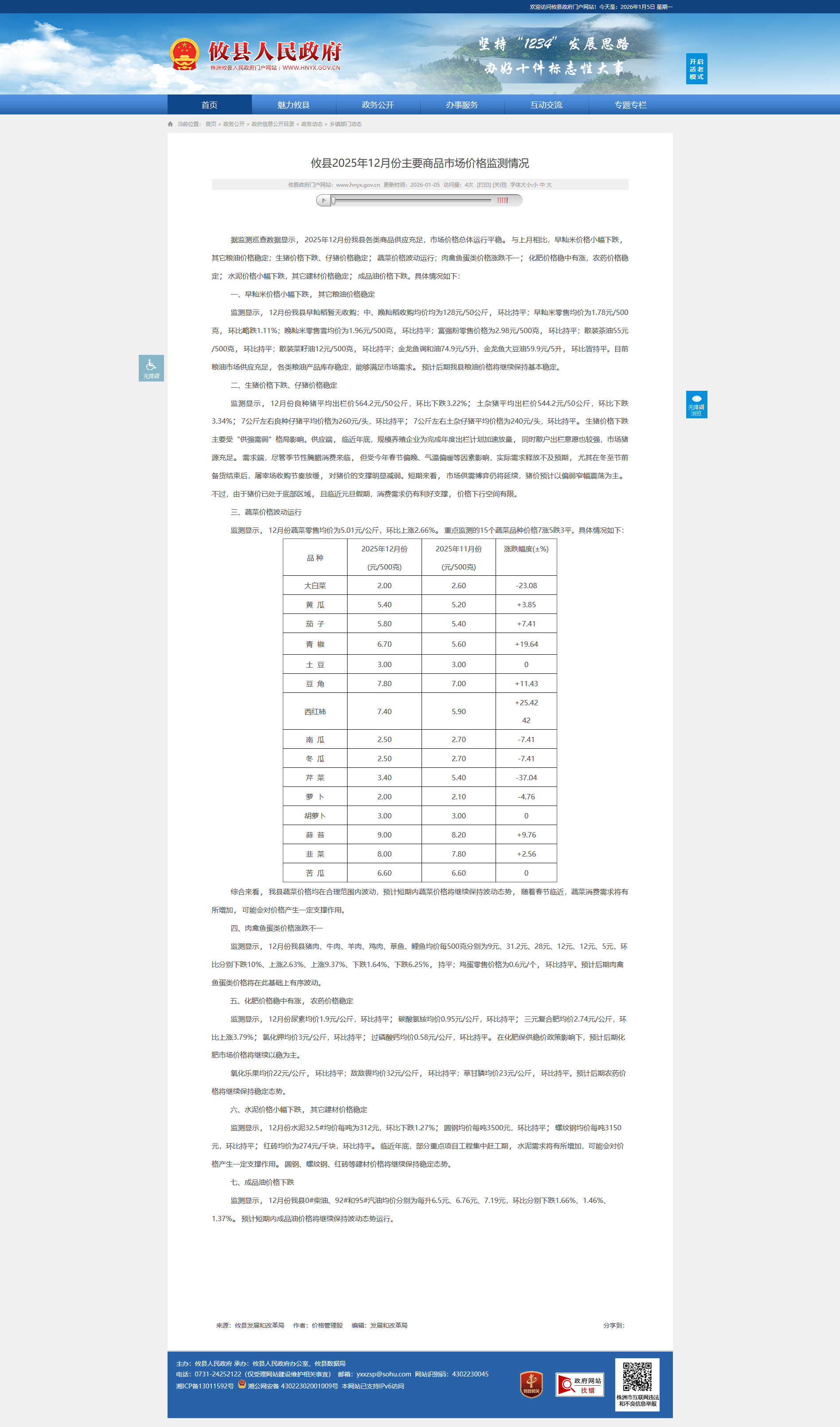 据监测巡查数据显示,2025年12月份我县各类商品供应充足,市场价格总体运行平稳。与上月相比,早籼米价格小幅下跌,其它粮油价格稳定;生猪价格下跌、仔猪价格稳定;蔬菜价格波动运行;肉禽鱼蛋类价格涨跌不一;化肥价格稳中有涨,农药价格稳定;水泥价格小幅下跌,其它建材价格稳定;成品油价格下跌。具体情况如下: