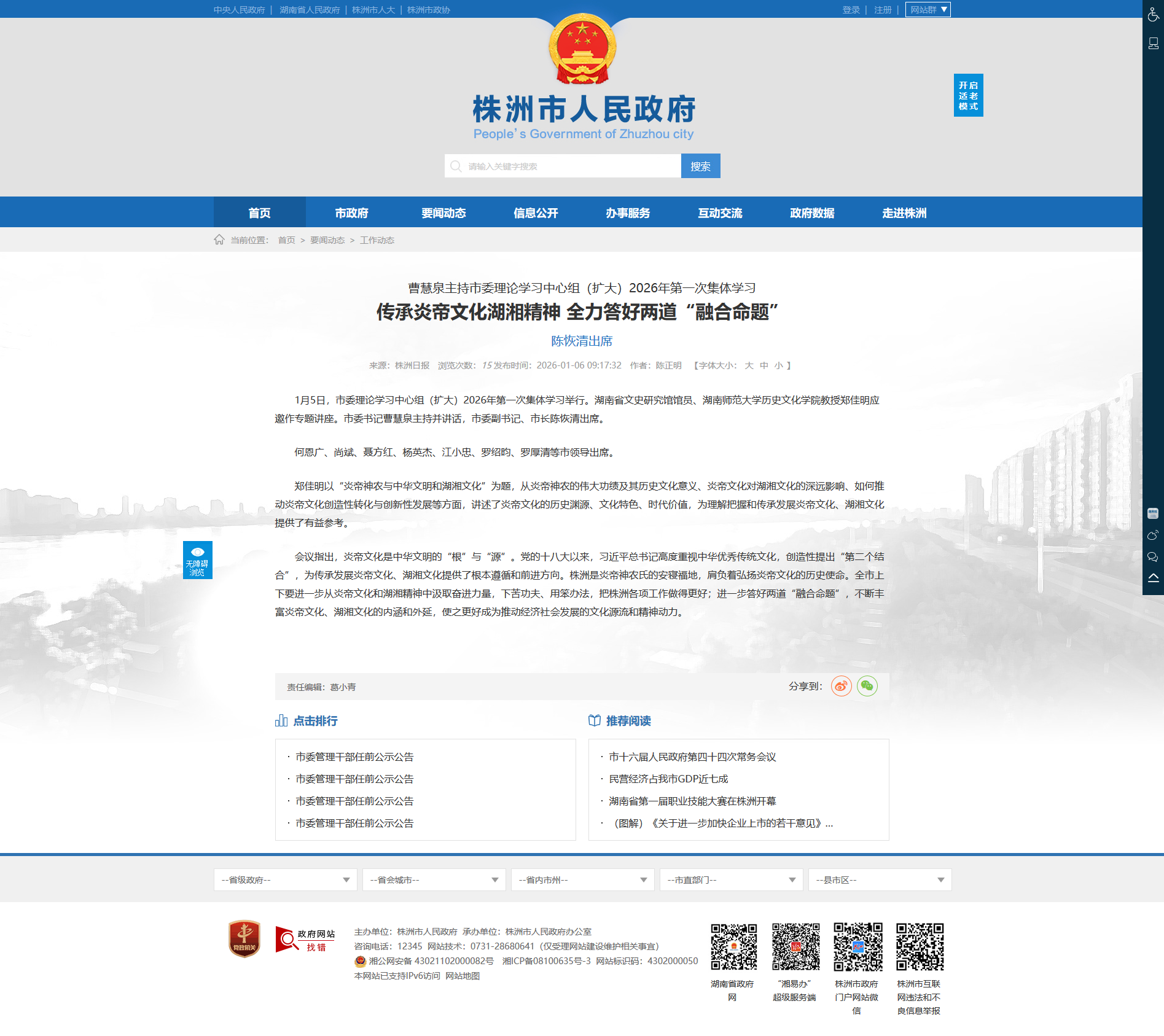 1月5日,市委理论学习中心组(扩大)2026年第一次集体学习举行。湖南省文史研究馆馆员、湖南师范大学历史文化学院教授郑佳明应邀作专题讲座。市委书记曹慧泉主持并讲话,市委副书记、市长陈恢清出席。