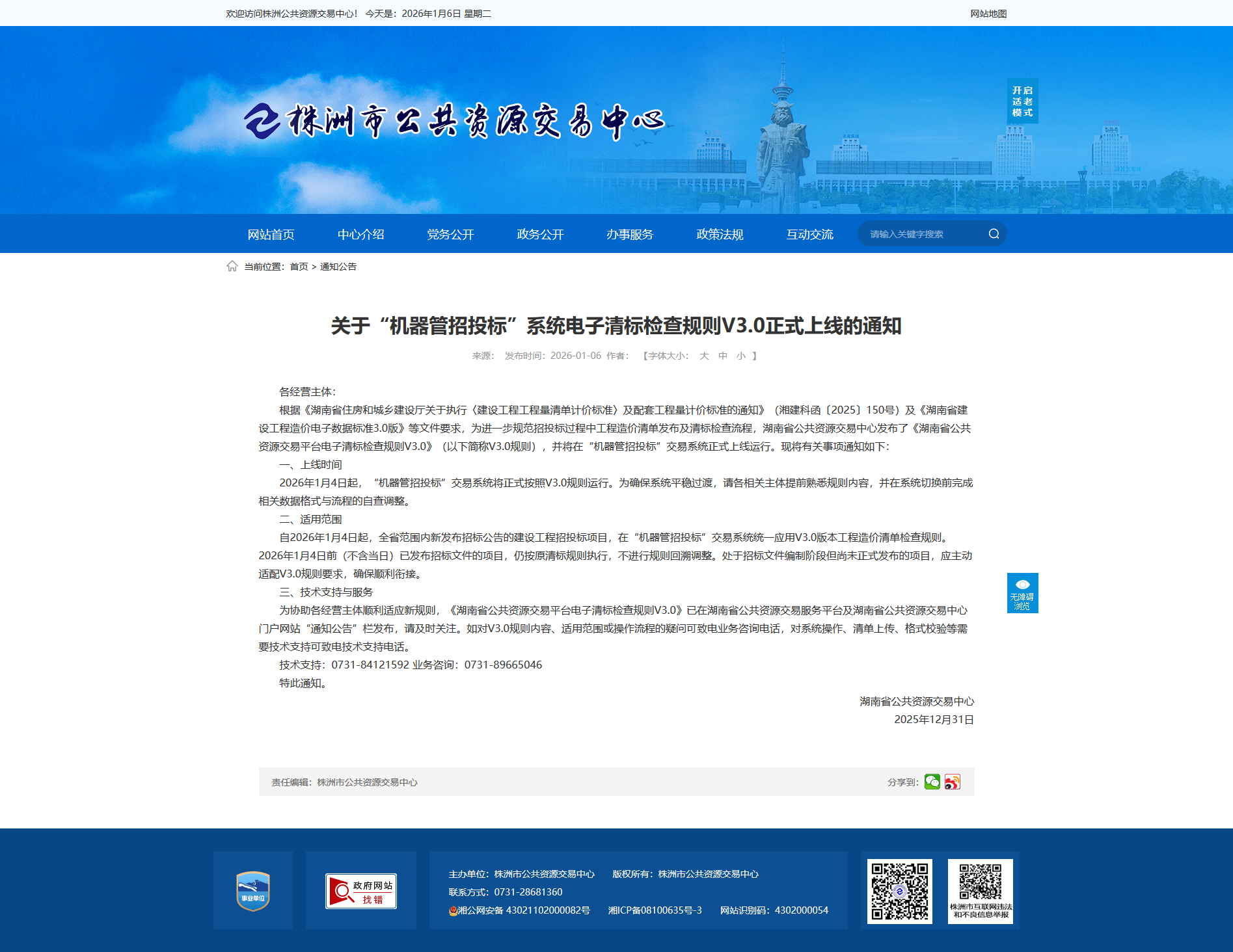 为协助各经营主体顺利适应新规则,《湖南省公共资源交易平台电子清标检查规则V3.0》已在湖南省公共资源交易服务平台及湖南省公共资源交易中心门户网站“通知公告”栏发布,请及时关注。如对V3.0规则内容、适用范围或操作流程的疑问可致电业务咨询电话,对系统操作、清单上传、格式校验等需要技术支持可致电技术支持电话。