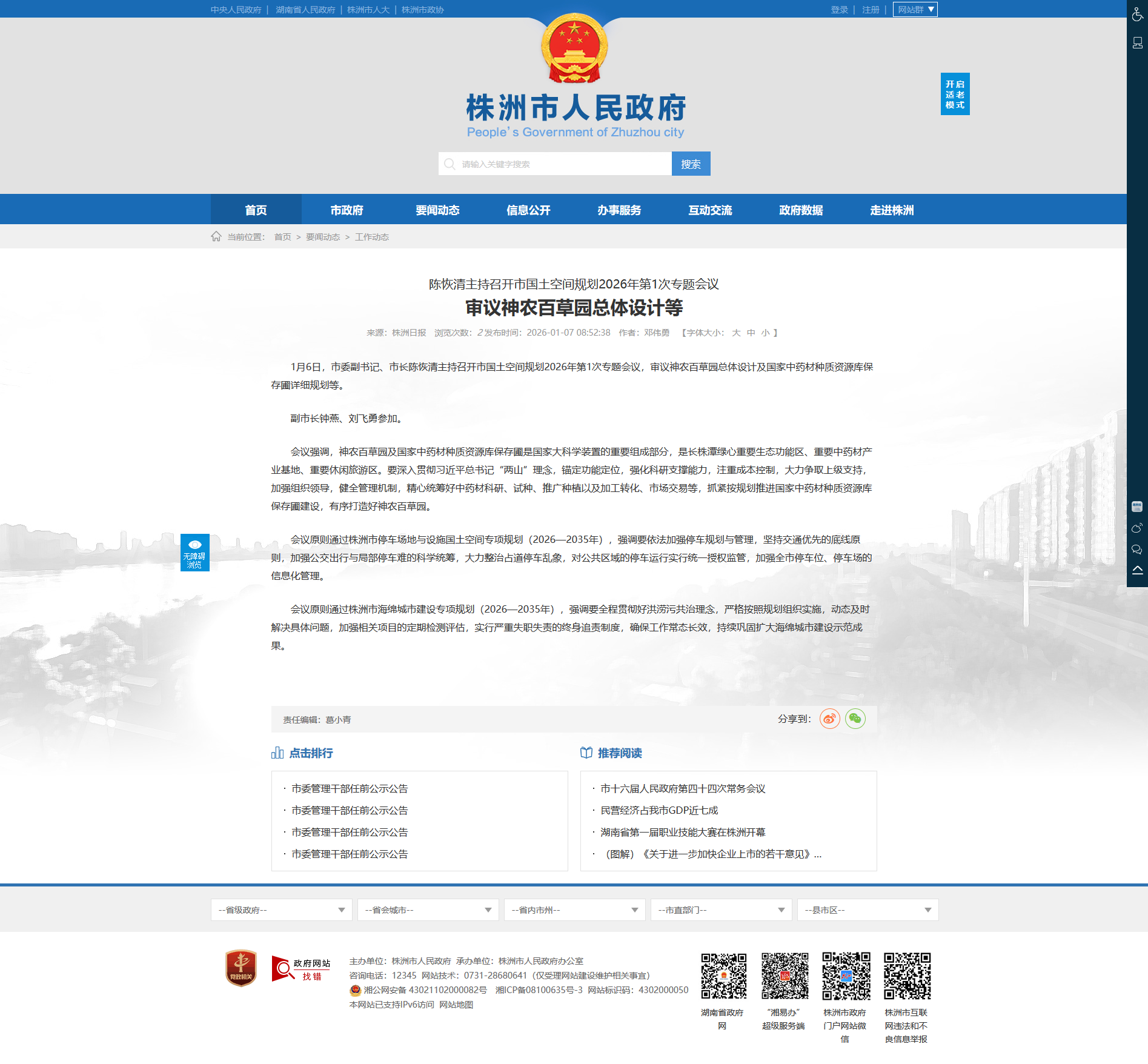 1月6日,市委副书记、市长陈恢清主持召开市国土空间规划2026年第1次专题会议,审议神农百草园总体设计及国家中药材种质资源库保存圃详细规划等。