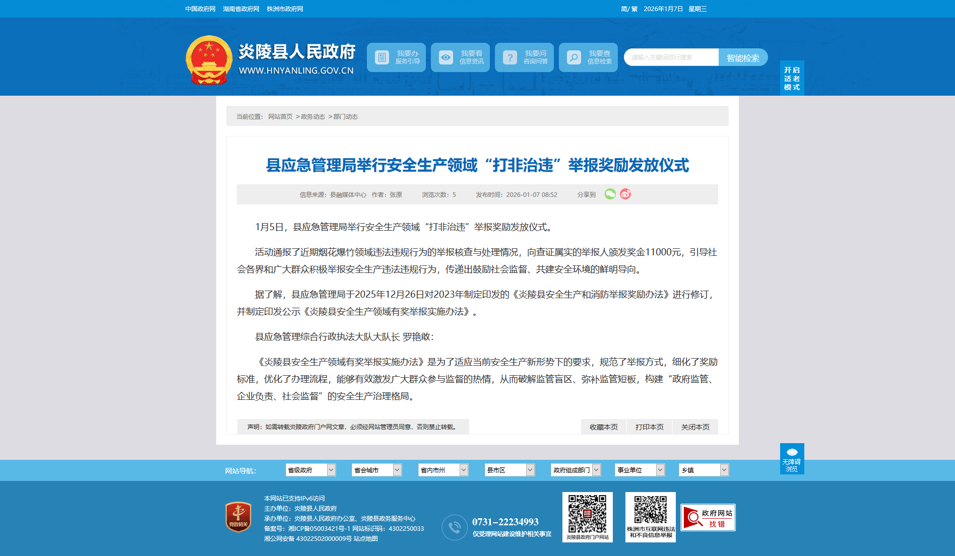 据了解,县应急管理局于2025年12月26日对2023年制定印发的《炎陵县安全生产和消防举报奖励办法》进行修订,并制定印发公示《炎陵县安全生产领域有奖举报实施办法》。
