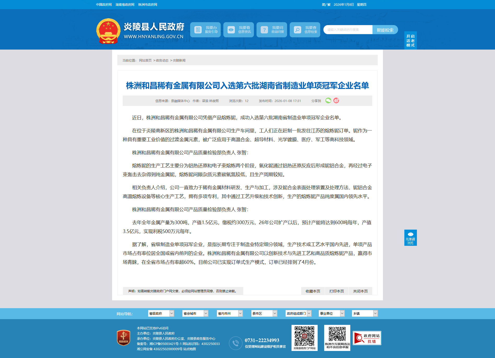 据了解,省级制造业单项冠军企业,是指长期专注于制造业特定细分领域,生产技术或工艺水平国内先进,单项产品市场占有率位居全国或省内前列的企业。株洲和昌稀有金属有限公司以创新技术与先进工艺和高品质熔炼铌产品,赢得市场青睐,在全省市场占有率超60%。目前公司已实现订单式生产模式,订单已经排到了4月份。
