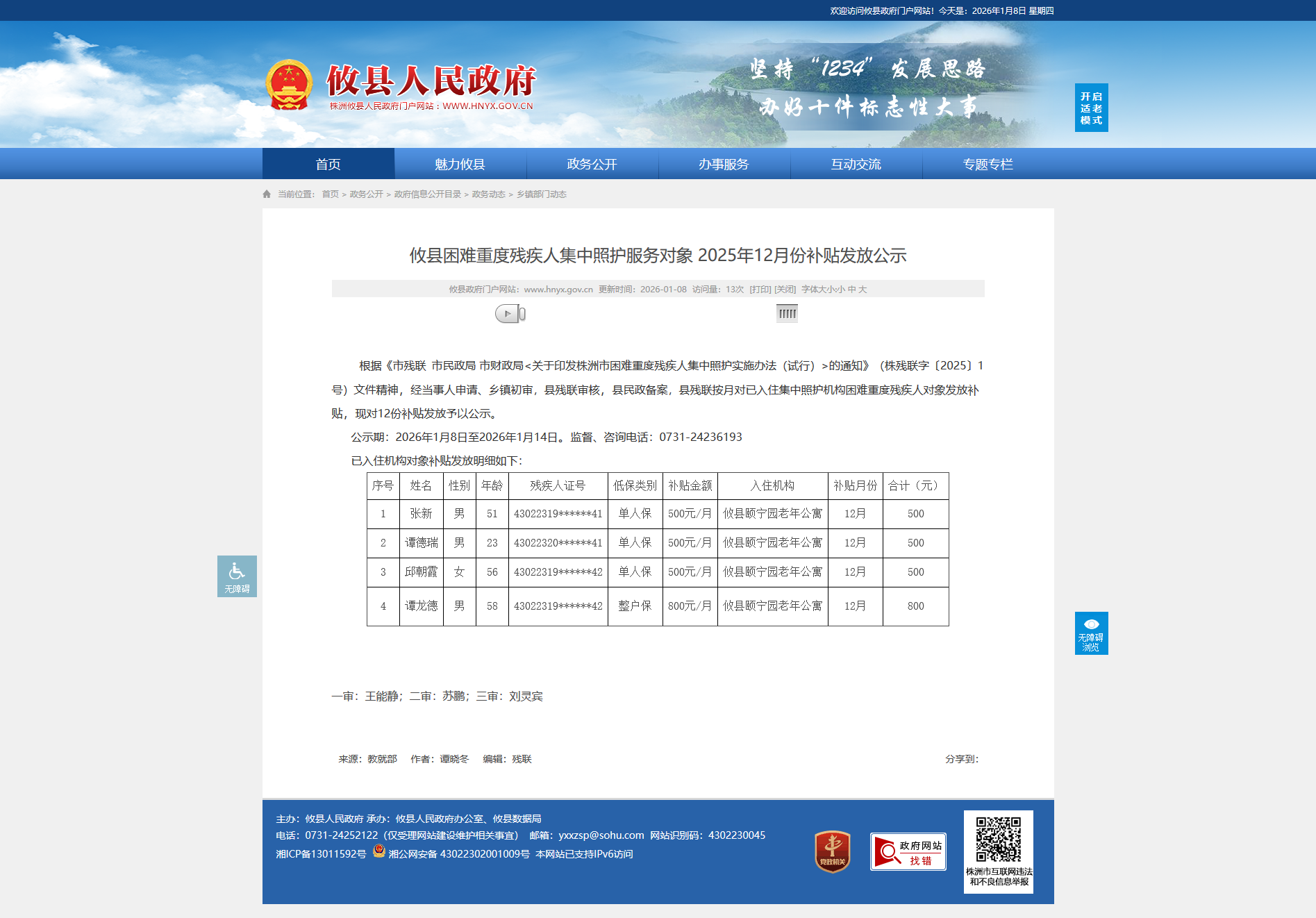 根据《市残联 市民政局 市财政局<关于印发株洲市困难重度残疾人集中照护实施办法(试行)>的通知》(株残联字〔2025〕1号)文件精神,经当事人申请、乡镇初审,县残联审核,县民政备案,县残联按月对已入住集中照护机构困难重度残疾人对象发放补贴,现对12份补贴发放予以公示。