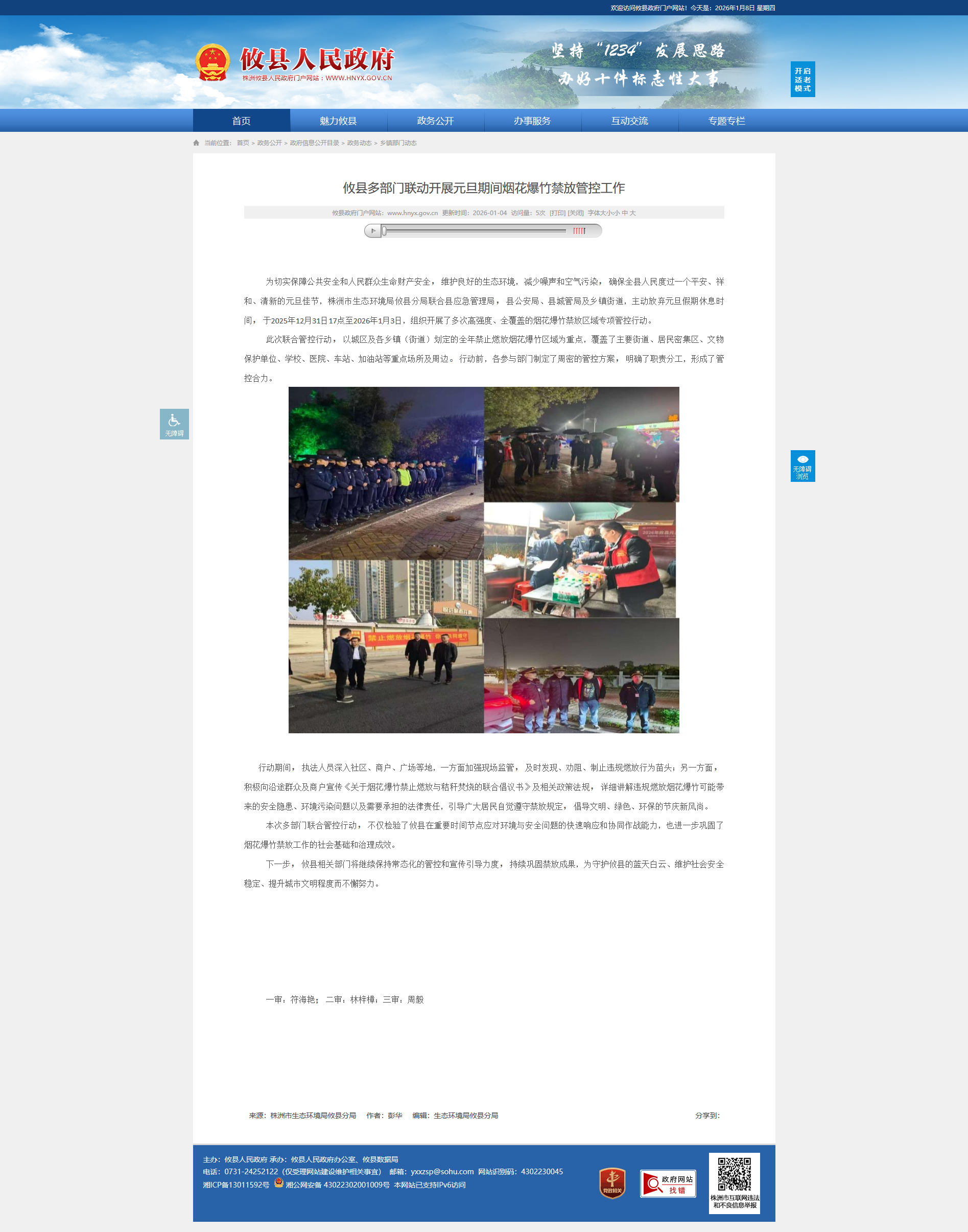 为切实保障公共安全和人民群众生命财产安全,维护良好的生态环境,减少噪声和空气污染,确保全县人民度过一个平安、祥和、清新的元旦佳节,株洲市生态环境局攸县分局联合县应急管理局,县公安局、县城管局及乡镇街道,主动放弃元旦假期休息时间,于2025年12月31日17点至2026年1月3日,组织开展了多次高强度、全覆盖的烟花爆竹禁放区域专项管控行动。