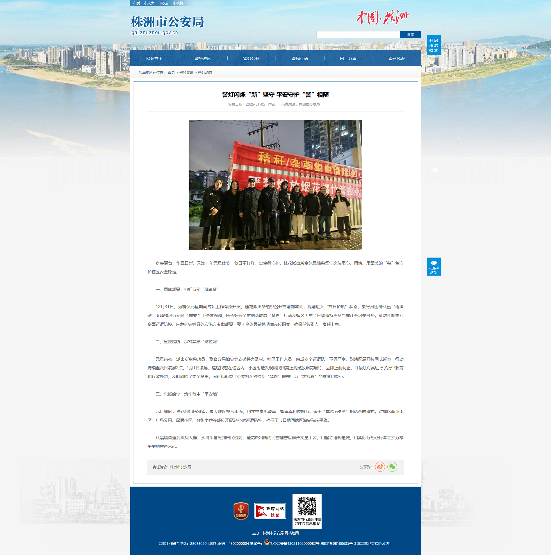 元旦期间,桂花派出所将警力最大限度投放街面,切实提高见警率、管事率和控制力。采用“车巡 步巡”相结合的模式,对辖区商业街区、广场公园、居民小区、背街小巷等部位开展24小时巡逻防控,确保了节日期间辖区治安秩序平稳。