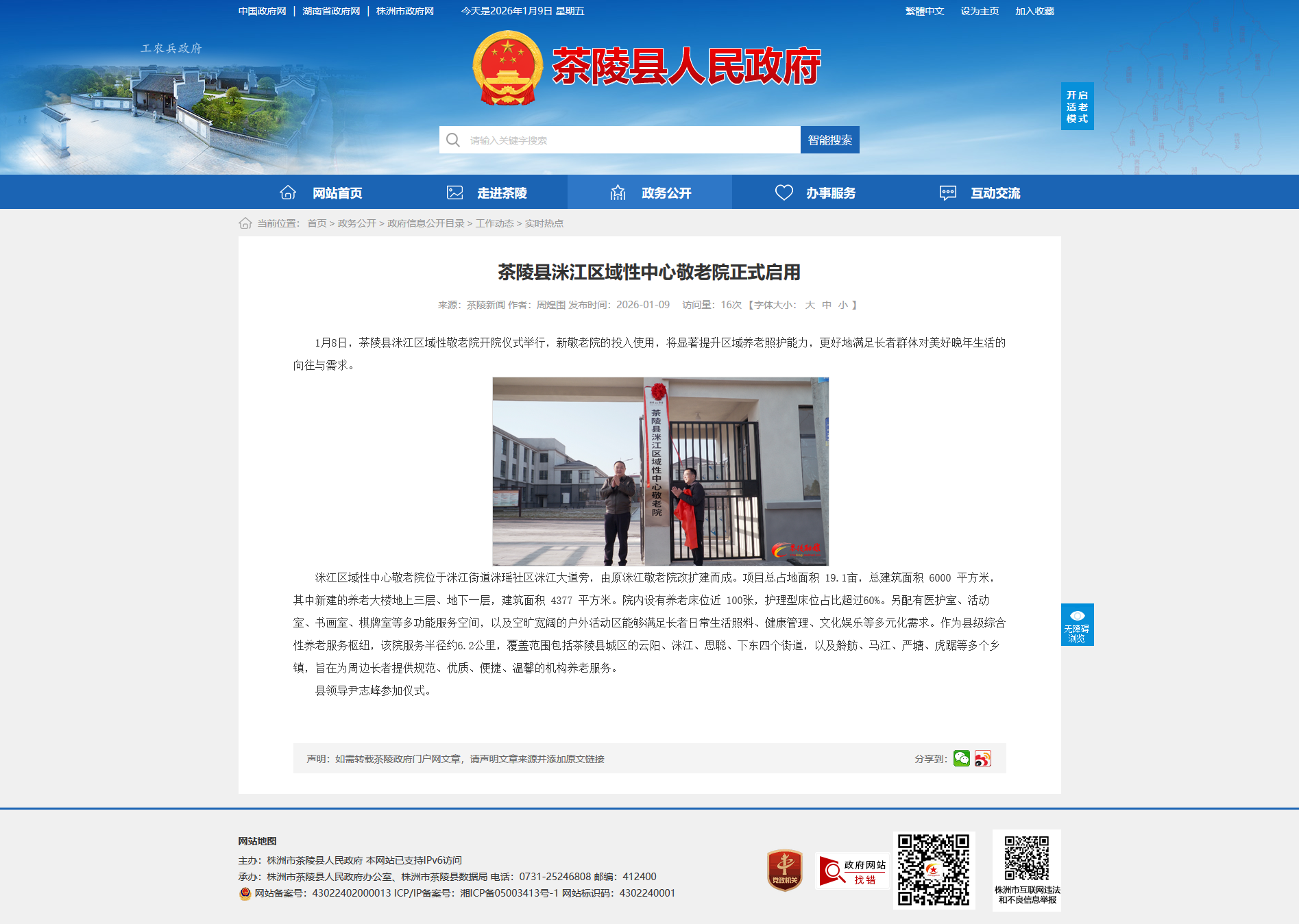1月8日,茶陵县洣江区域性敬老院开院仪式举行,新敬老院的投入使用,将显著提升区域养老照护能力,更好地满足长者群体对美好晚年生活的向往与需求。
