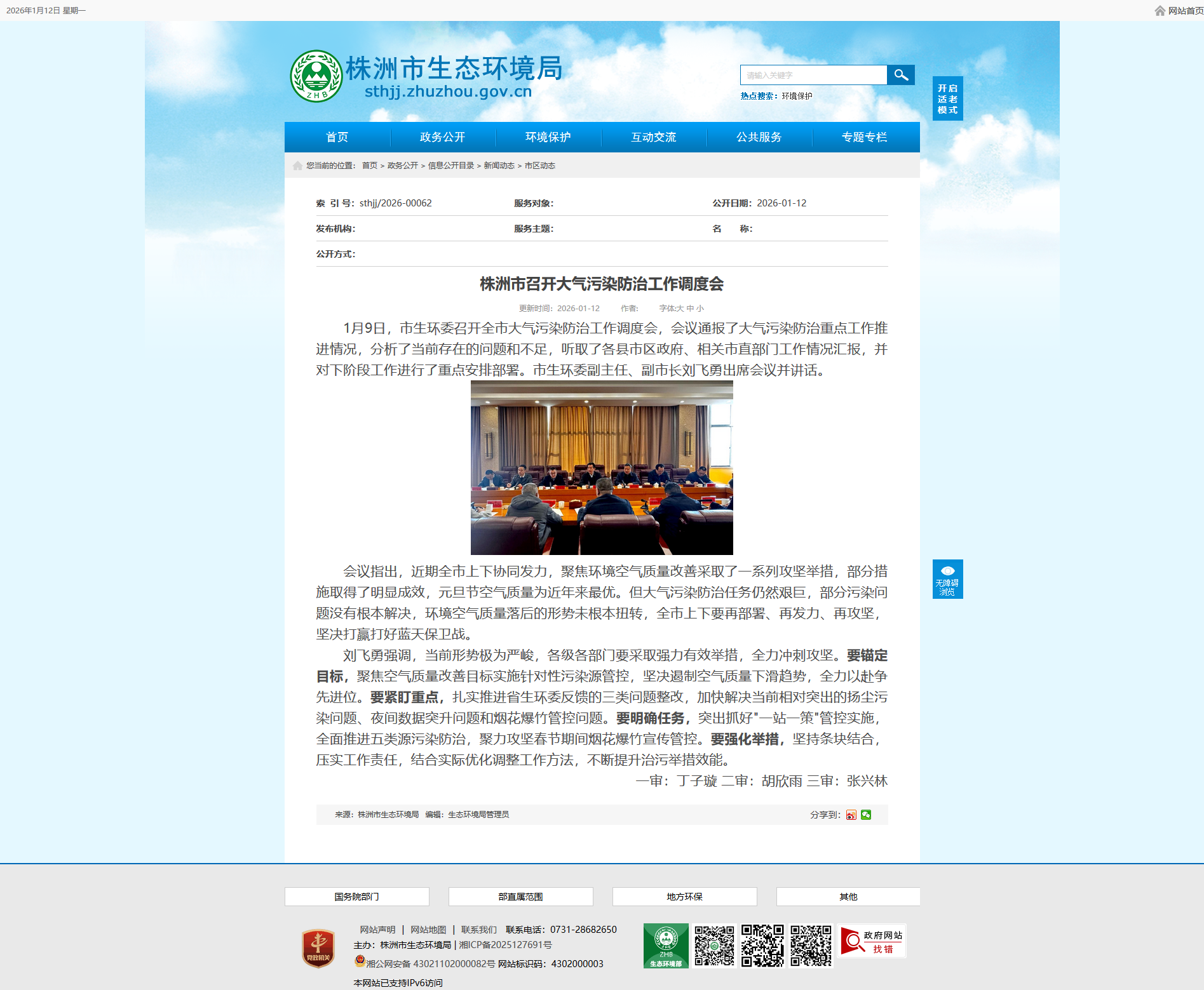 1月9日,市生环委召开全市大气污染防治工作调度会,会议通报了大气污染防治重点工作推进情况,分析了当前存在的问题和不足,听取了各县市区政府、相关市直部门工作情况汇报,并对下阶段工作进行了重点安排部署。市生环委副主任、副市长刘飞勇出席会议并讲话。