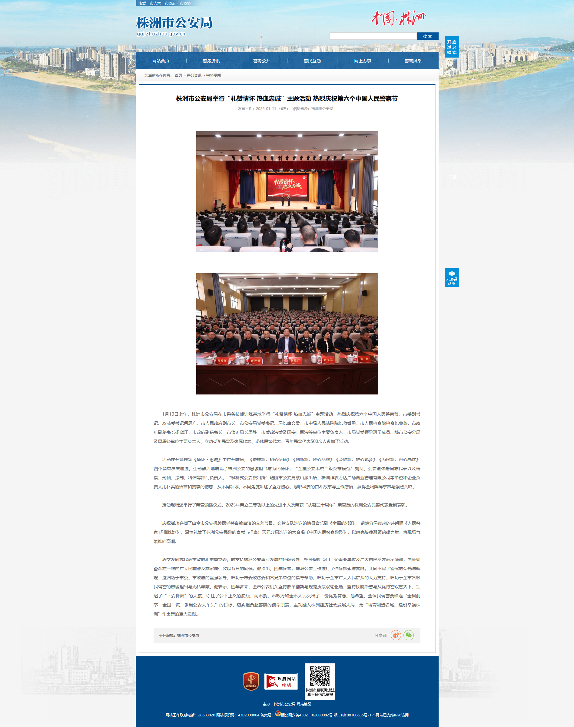 庆祝活动穿插了由全市公安机关民辅警自编自演的文艺节目。交管支队选送的情景音乐剧《幸福的湘B》、荷塘分局带来的诗朗诵《人民警察 闪耀株洲》,深情礼赞了株洲公安民警的奉献与担当;天元分局选送的大合唱《中国人民警察警歌》,以嘹亮旋律凝聚磅礴力量,将现场气氛推向高潮。