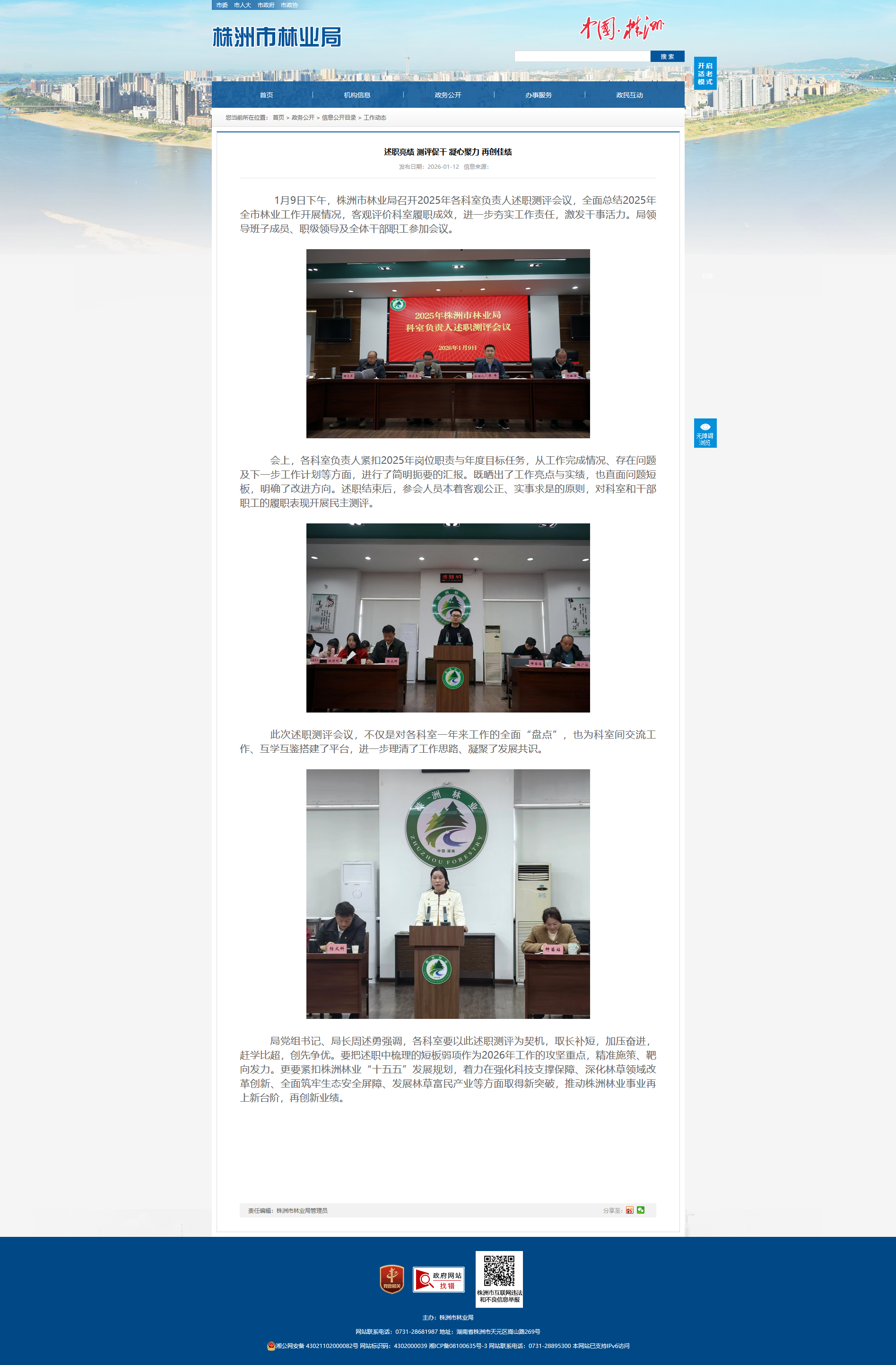 1月9日下午,株洲市林业局召开2025年各科室负责人述职测评会议,全面总结2025年全市林业工作开展情况,客观评价科室履职成效,进一步夯实工作责任,激发干事活力。局领导班子成员、职级领导及全体干部职工参加会议。