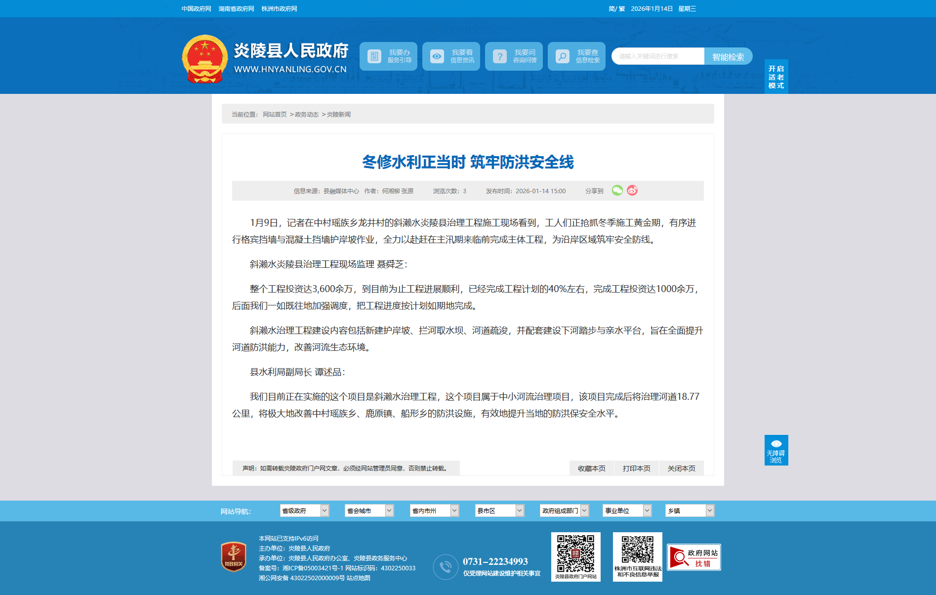 1月9日,记者在中村瑶族乡龙井村的斜濑水炎陵县治理工程施工现场看到,工人们正抢抓冬季施工黄金期,有序进行格宾挡墙与混凝土挡墙护岸坡作业,全力以赴赶在主汛期来临前完成主体工程,为沿岸区域筑牢安全防线。