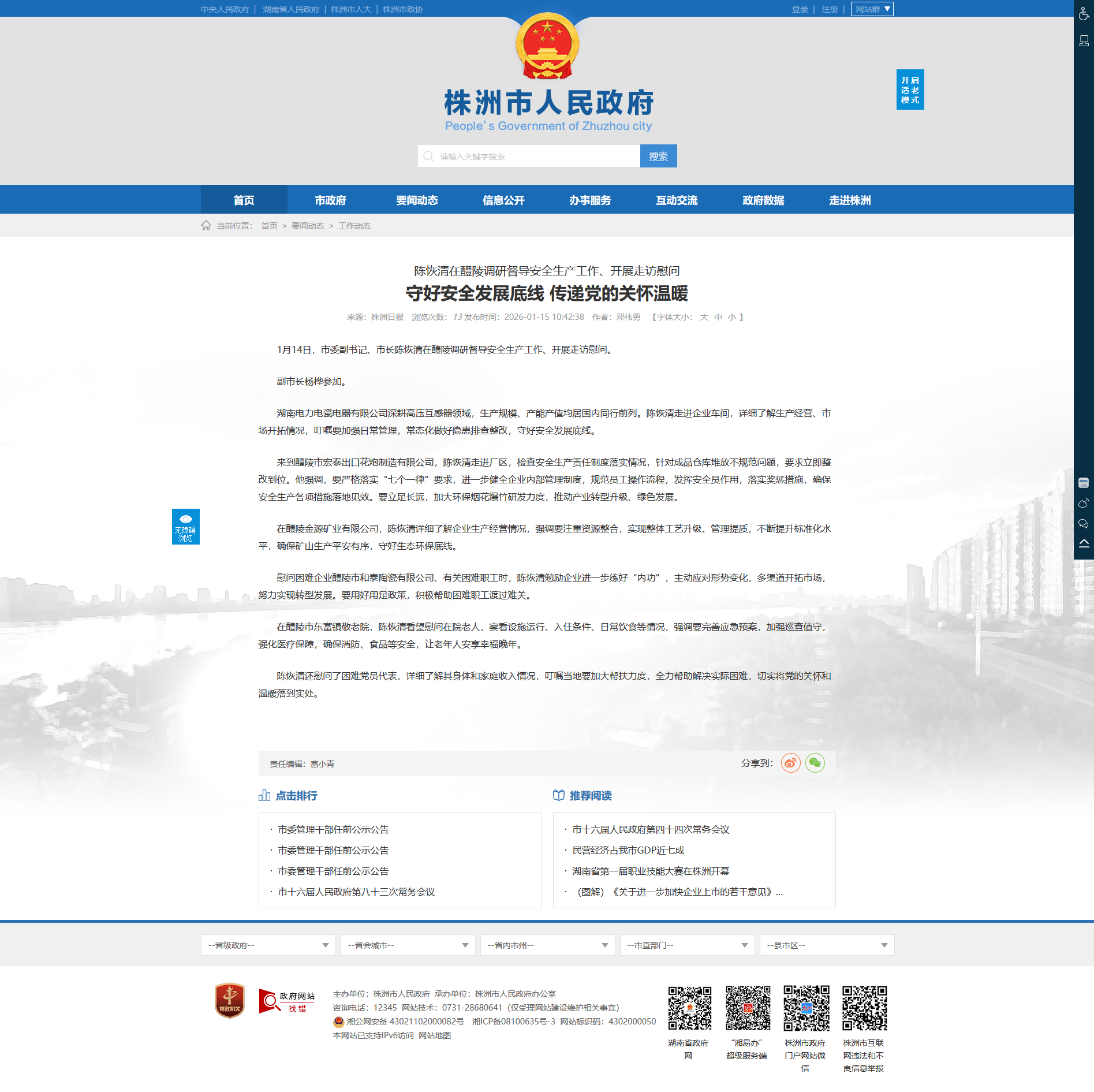 1月14日,市委副书记、市长陈恢清在醴陵调研督导安全生产工作、开展走访慰问。