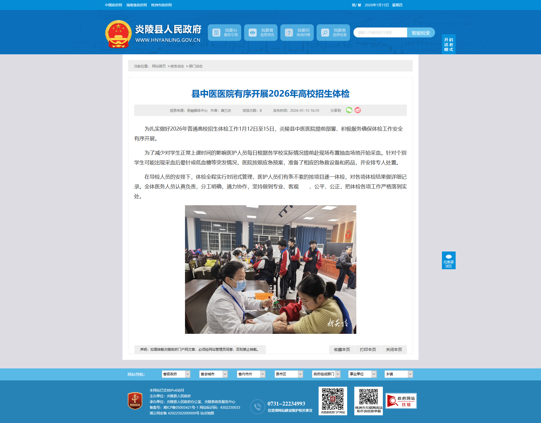 为扎实做好2026年普通高校招生体检工作1月12日至15日,炎陵县中医医院提前部署、积极服务确保体检工作安全有序开展。