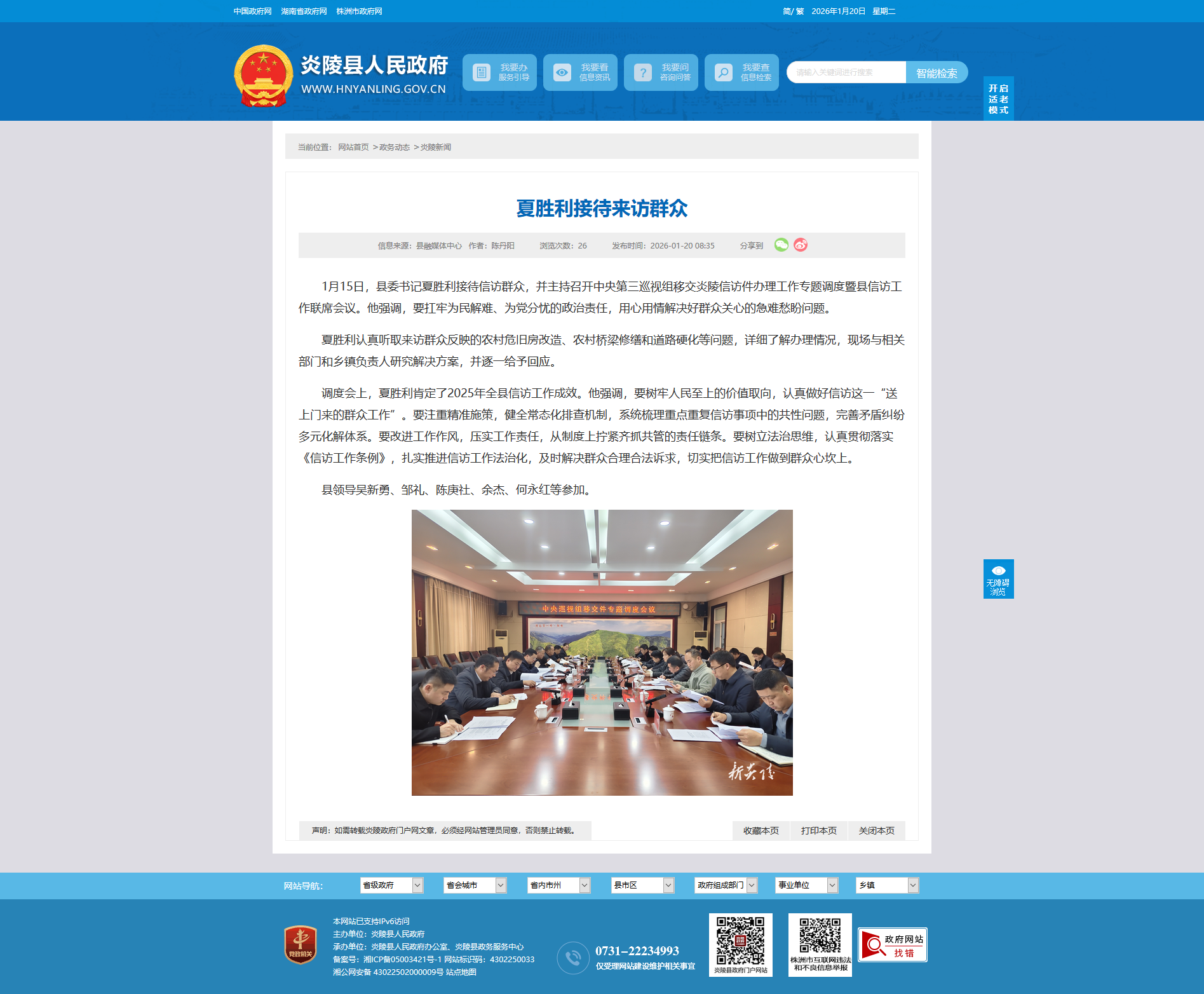 1月15日,县委书记夏胜利接待信访群众,并主持召开中央第三巡视组移交炎陵信访件办理工作专题调度暨县信访工作联席会议。他强调,要扛牢为民解难、为党分忧的政治责任,用心用情解决好群众关心的急难愁盼问题。