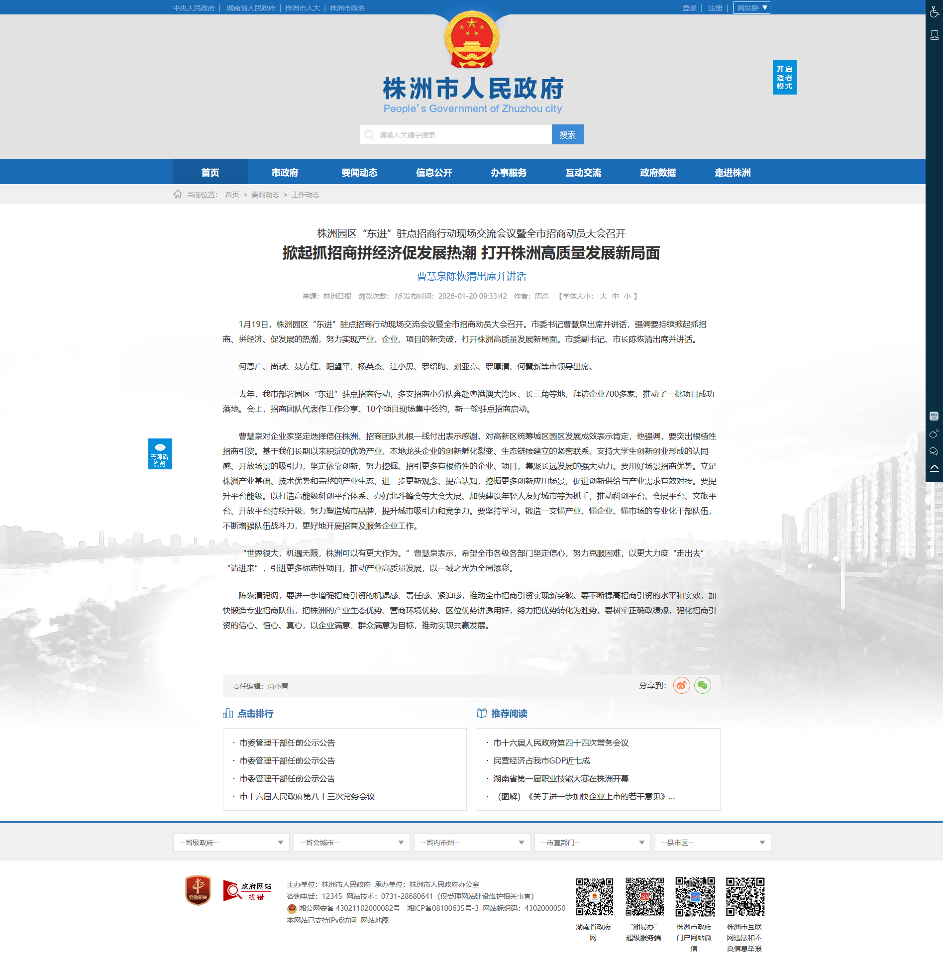 1月19日,株洲园区“东进”驻点招商行动现场交流会议暨全市招商动员大会召开。市委书记曹慧泉出席并讲话,强调要持续掀起抓招商、拼经济、促发展的热潮,努力实现产业、企业、项目的新突破,打开株洲高质量发展新局面。市委副书记、市长陈恢清出席并讲话。