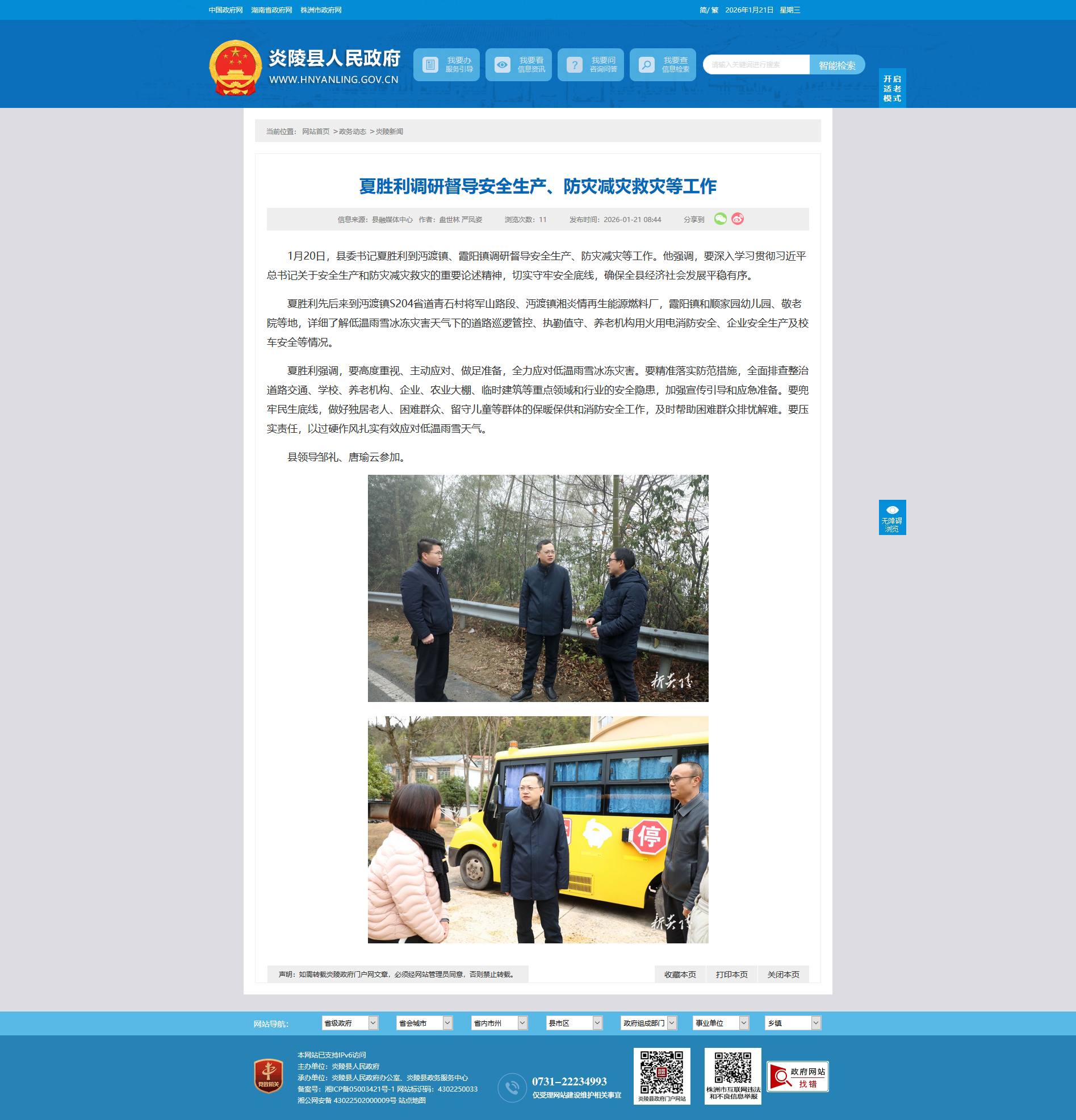 夏胜利强调,要高度重视、主动应对、做足准备,全力应对低温雨雪冰冻灾害。要精准落实防范措施,全面排查整治道路交通、学校、养老机构、企业、农业大棚、临时建筑等重点领域和行业的安全隐患,加强宣传引导和应急准备。要兜牢民生底线,做好独居老人、困难群众、留守儿童等群体的保暖保供和消防安全工作,及时帮助困难群众排忧解难。要压实责任,以过硬作风扎实有效应对低温雨雪天气。