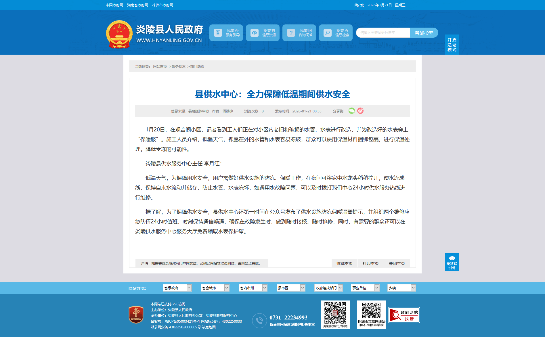 据了解,为了保障供水安全,县供水中心还第一时间在公众号发布了供水设施防冻保暖温馨提示,并组织两个维修应急队伍24小时值班,时刻保持通信畅通,确保在故障发生时,做到随时接报、随时抢修,同时,有需要的群众还可以在炎陵供水服务中心服务大厅免费领取水表保护罩。